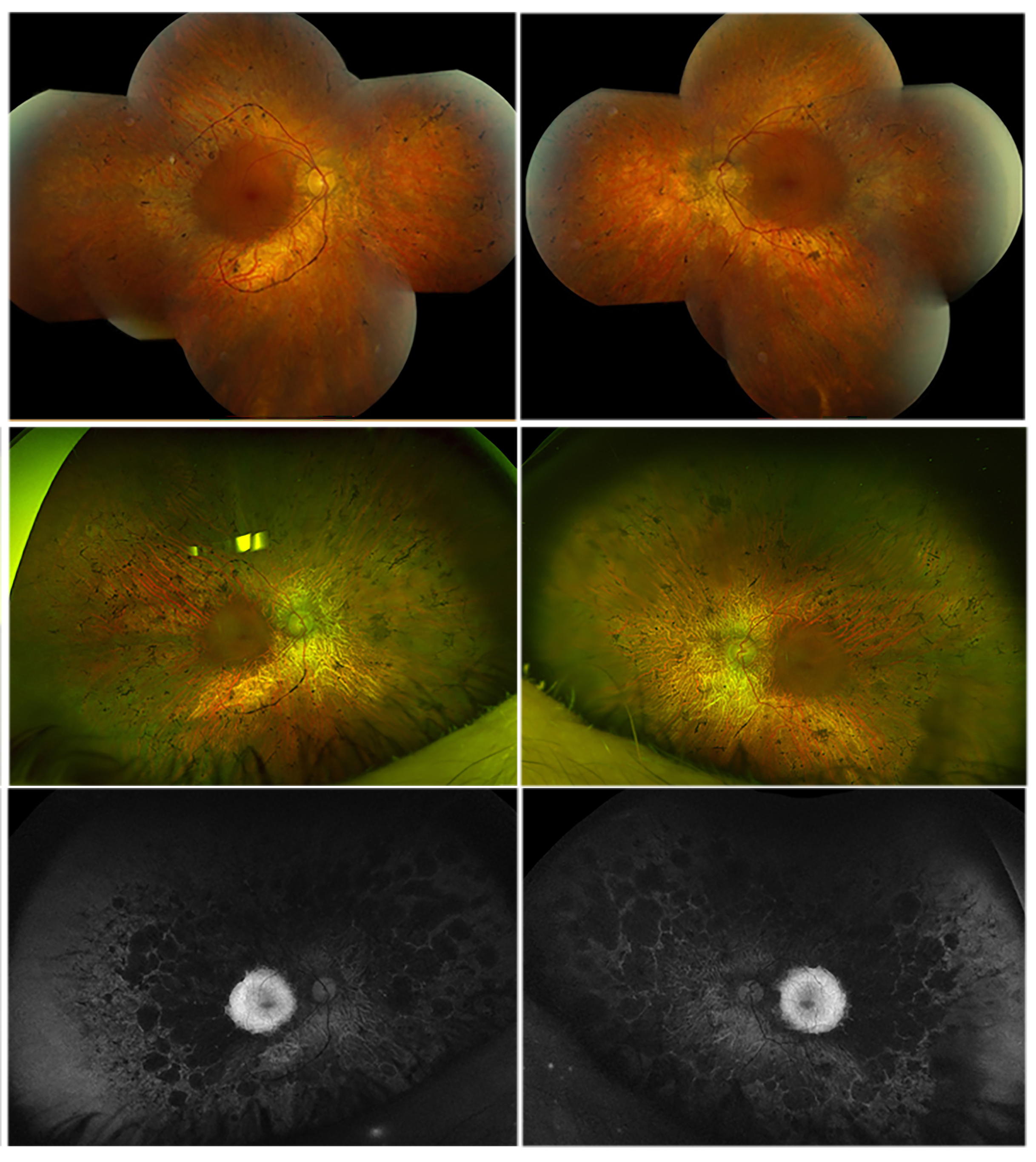 years showing bone spicule retinal degeneration extending into the peripheral retina. The middle row shows color fundus images