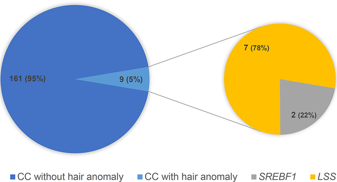 cataracts who have and do not have hair anomalies. The sub-pie charts show the pathogenic genes identified in the patients