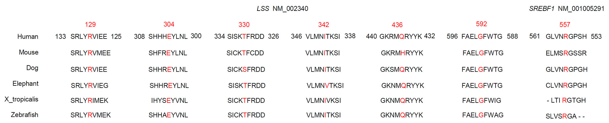 The sequences of LSS proteins and SREBF1 proteins from six species from humans to zebrafish have been compared and aligned. The target amino acid residue in human LSS and SREBF1 is highly conserved across species.
