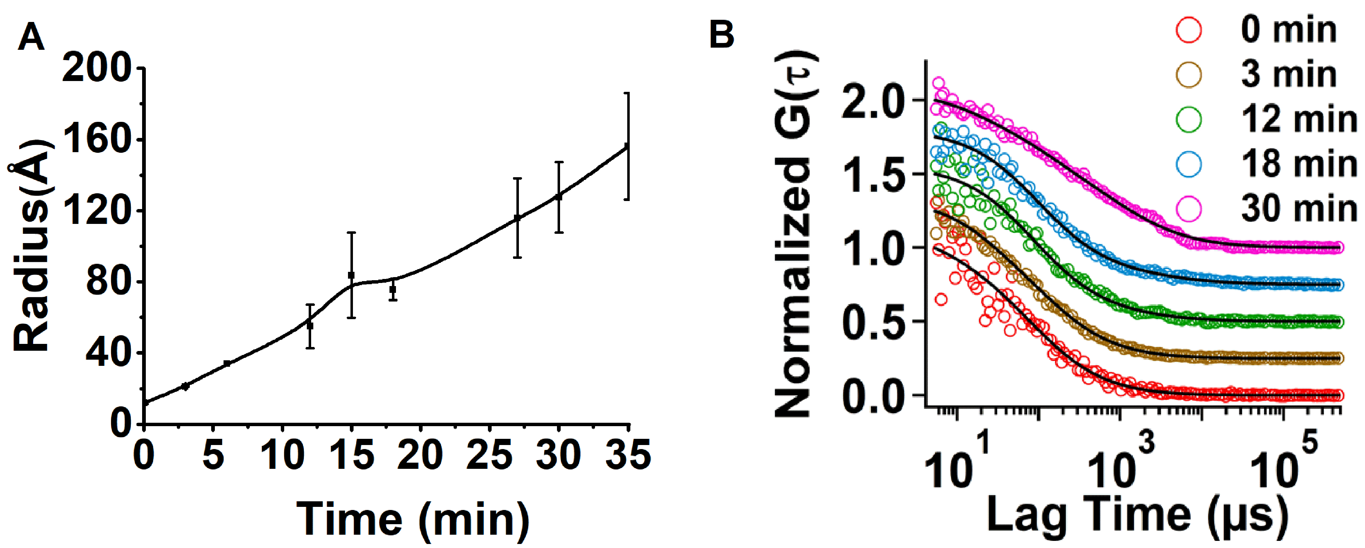 Figure 2. Fluorescence correlation spectroscopy (FCS) analysis of γD-crystallin protein aggregation at pH 2.5. A: The radius of the aggregation intermediates formed during the aggregation pathway at pH 2.5, calculated using diffusion