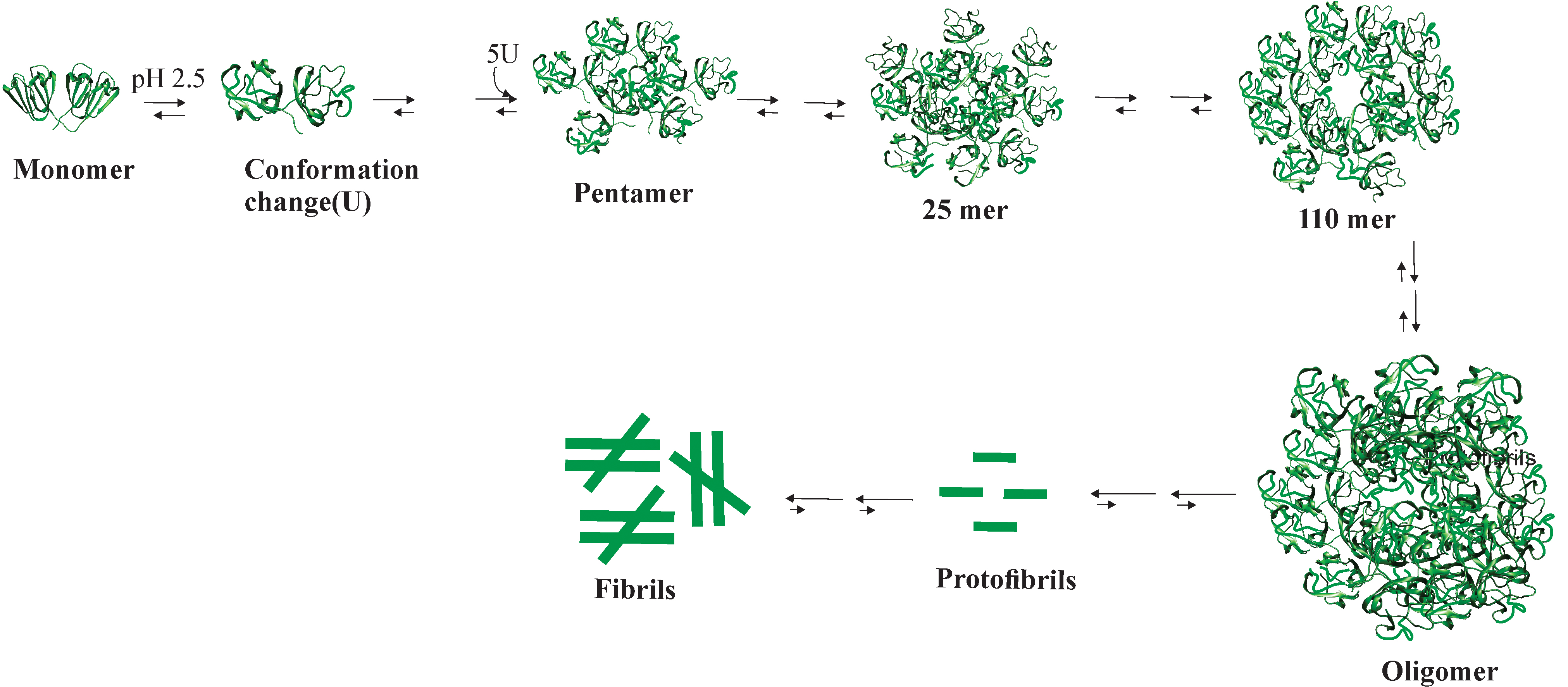 Proposed aggregation pathway for γD-crystallin protein at pH 2.5. The monomer PDB (Protein Data Bank) ID is 1HK0, while all other images are for representative purposes only.