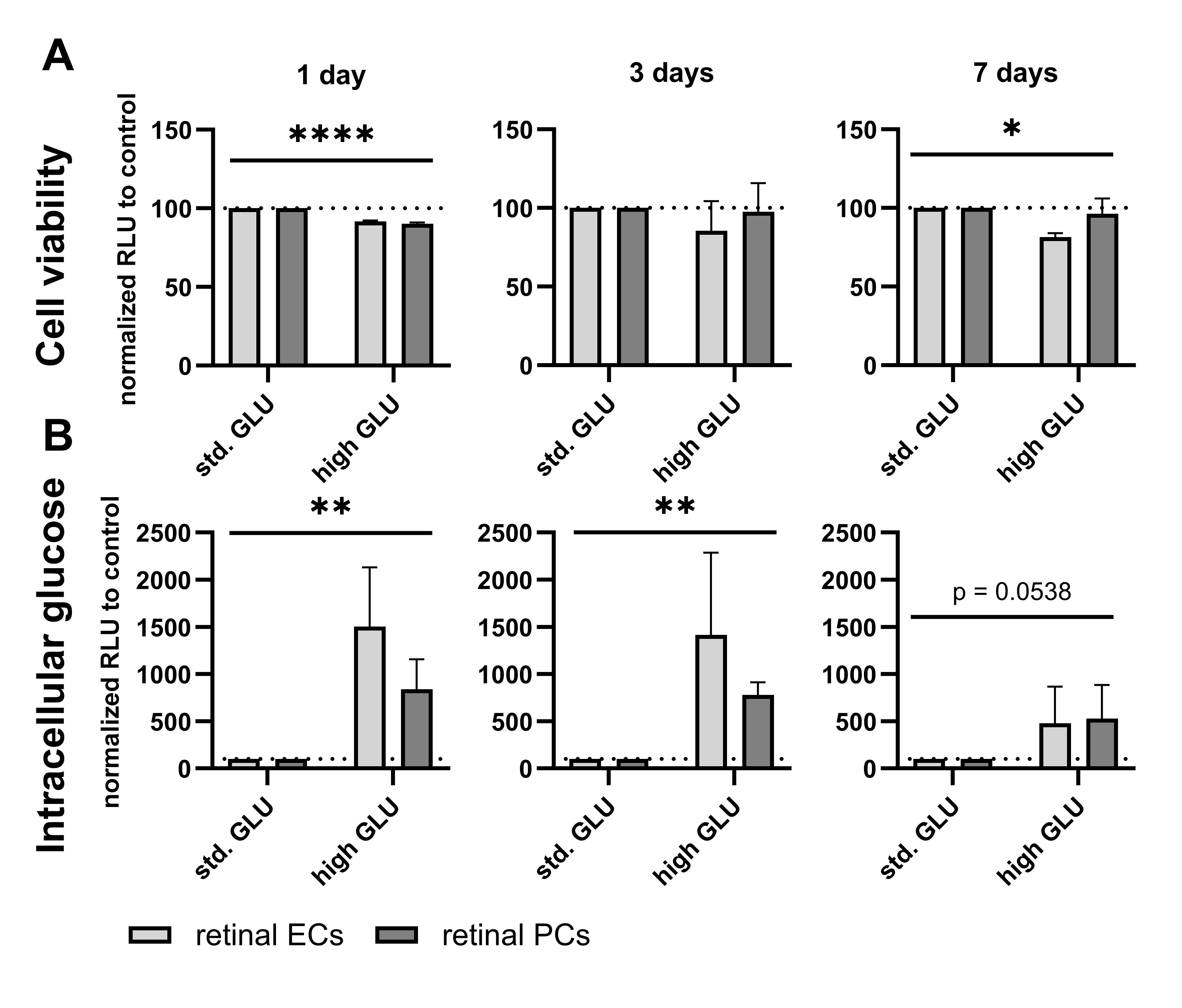Figure 2. High glucose levels affect the viability and intracellular glucose levels of retinal ECs and PCs. A: Relative and normalized number of viable ECs and PCs cultured for 1 day, 3 days, and 7 days under standard and high-glucose