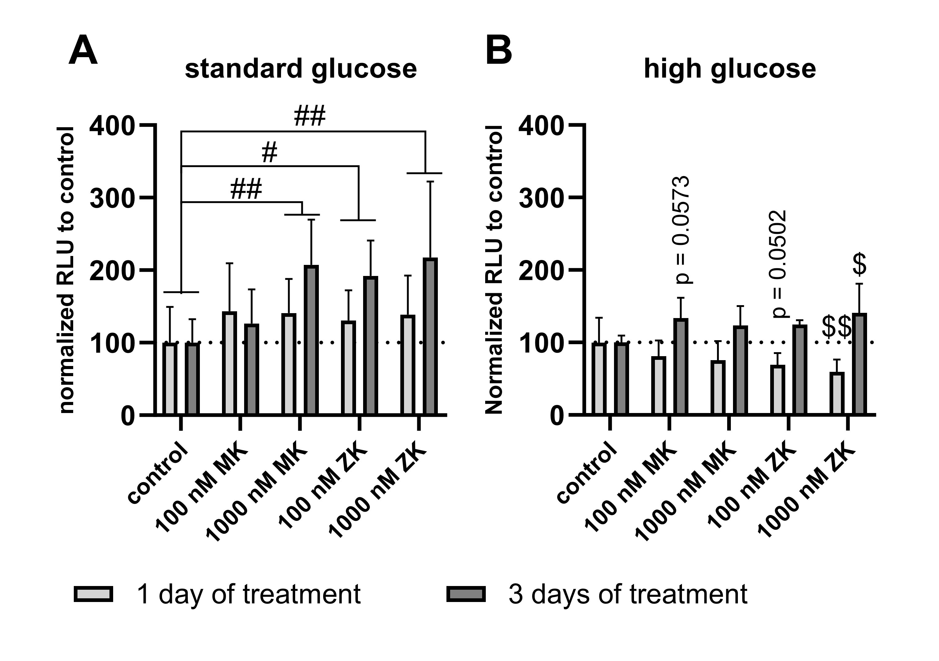 in ARPE-19 cells treated for 1 day or 3 days with 100 nM MK, 1,000 nM MK, 100 nM ZK, or 1,000 nM ZK under (A) standard and (B) high-glucose conditions. The data are presented as bar graphs ± SDs, n = 4-5. Repeated-measures two-way analysis of variance