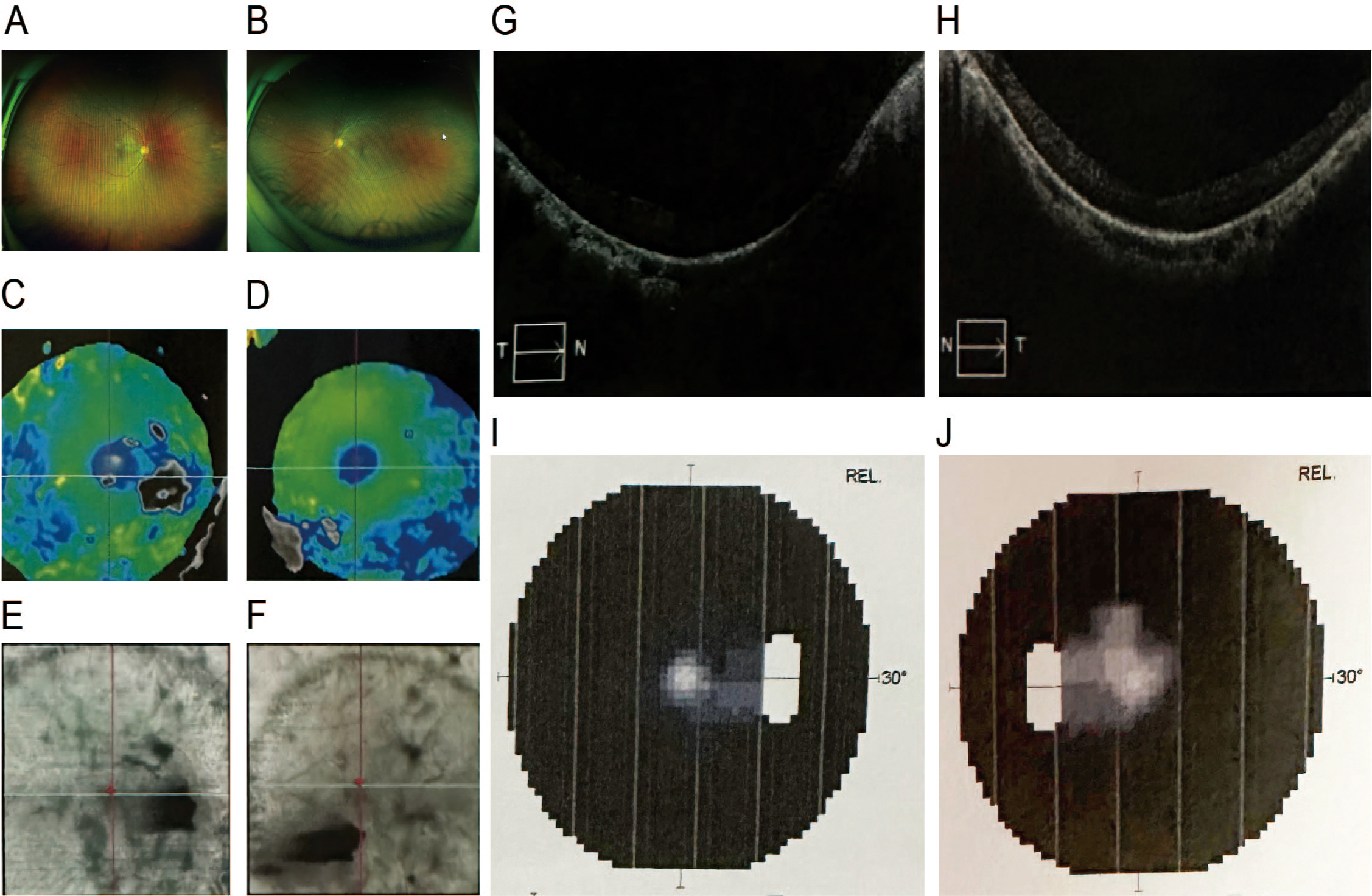 Figure 2. The clinical phenotype of proband (III). A and B images show macular OCT: thinning of the nerve fibre layer thickness in the macula; C: OD ILM-PRE thickness, fovea centralis (depression in the macular retina, most sensitive optic region): 248, 76; D: OS ILM-PRE thickness, fovea centralis (depression in the macular retina, most sensitive optic region): 249, 72; E: OCT fundus for OD (including choroid, retina, optic nerve, etc.); F: OCT fundus for OS (including choroid, retina, optic nerve, etc.); G: Brightness-mode ultrasound for OD; H: Brightness-mode Ultrasound for OS; I and J images demonstrate tubular visual field.