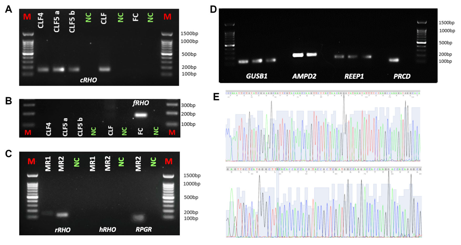 of canine (A) and feline (B) RHO was performed. C: Targeted PCR amplification was carried out for rhesus RHO (rRHO) and RPGR, as well as human RHO (hRHO), using DNA extracted from archival epoxy resin-embedded rhesus samples (MR1–MR2). M-100 denotes the marker. D: Targeted PCR amplification of canine GUSB1, AMPD2, REEP1, and PRCD was performed using DNA extracted from archival epoxy resin-embedded canine samples (CLF1–CLF5). CLF4 represents