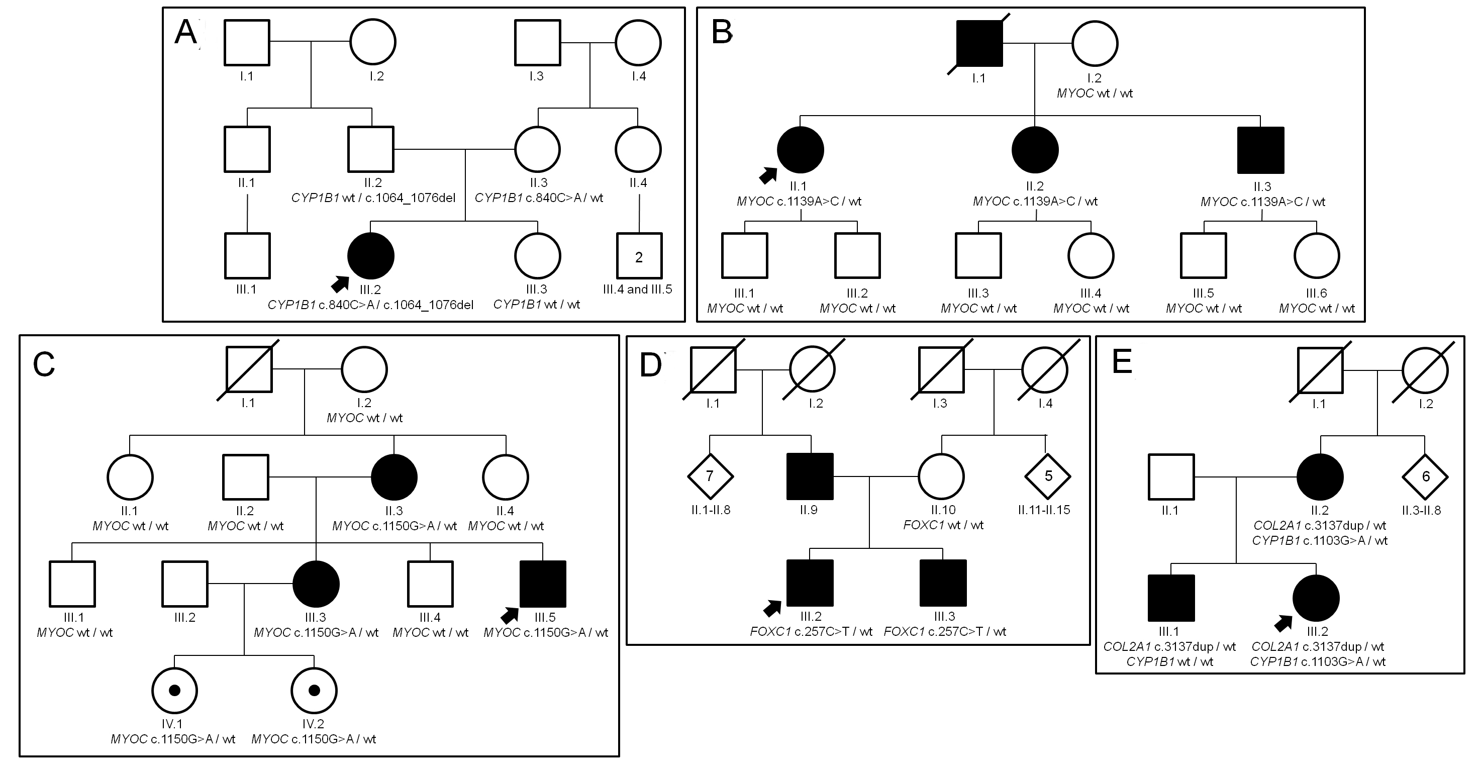 congenital or juvenile glaucoma; unfilled symbols represent unaffected individuals; and symbols with a black dot inside correspond