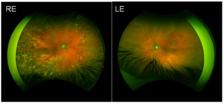 due to a previous central retinal vein occlusion. The RE presents filiform vessels and underwent panretinal photocoagulation