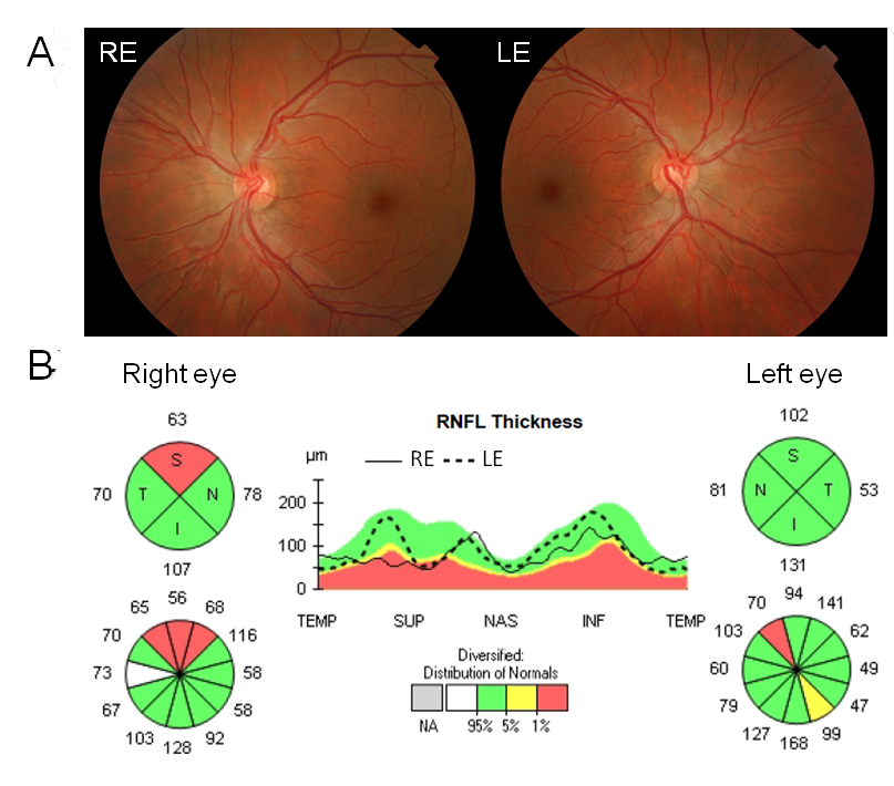 left eye (LE) show a relatively preserved neuroretinal rim in both eyes (A). Retinal nerve fiber layer (RNFL) analysis performed with Cirrus optical coherence tomography (OCT) reveals a superior defect