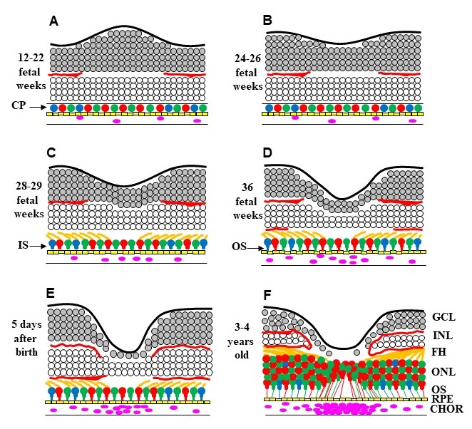 F: This image shows the fovea by the fourth year of life, where the foveal region is packed with CPs in the outer nuclear layer