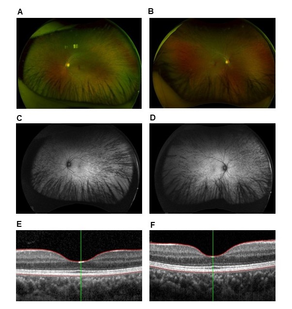 Optos ultra-widefield color imaging in the patient’s left (A) and right (B) eyes. Fundus autofluorescence imaging in the patient’s left (C) and right (D) eyes, showing abnormal pigmentary streaks in the peripheral retina. Optical coherence tomography imaging in the patient’s