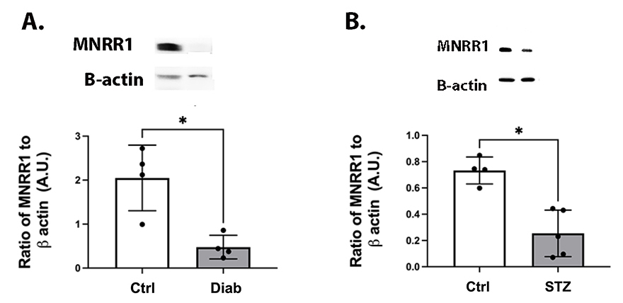 (A) Control and (B) diabetic mice. *p < 0.05 versus ctrl measured by t test. n = 5 for all groups.