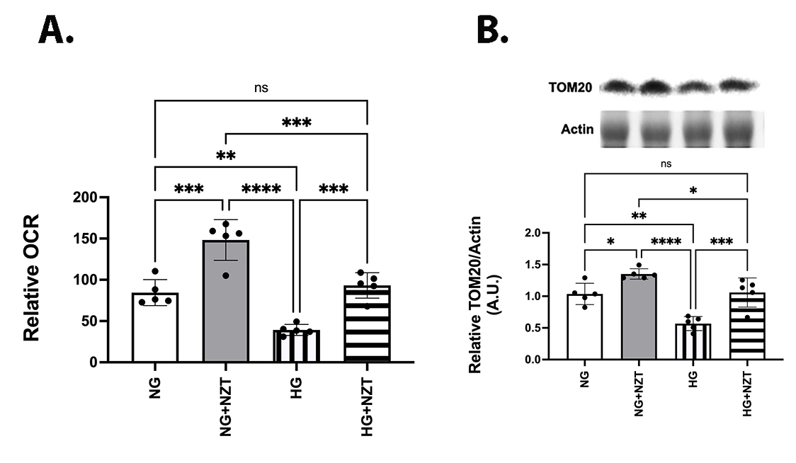 Figure 5. Effect of nitazoxanide and glucose concentration on mitochondrial properties. A. Relative OCR levels were measured in a Seahorse XFe24 Bioanalyzer for RECs grown in normal (5 mM) or high (25 mM) glucose