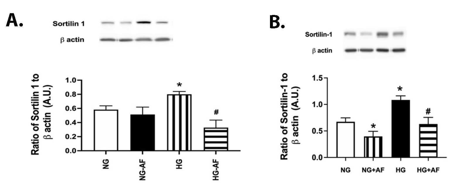 Figure 2. Sortilin protein levels in human Müller cells (A) and rat Müller cells (rMC-1, B) grown in normal glucose (NG) or high glucose (HG) and treated with AF38469. *p < 0.05 versus NG, #p < 0.05 versus HG, assessed by one-way analysis of variance. n = 4.