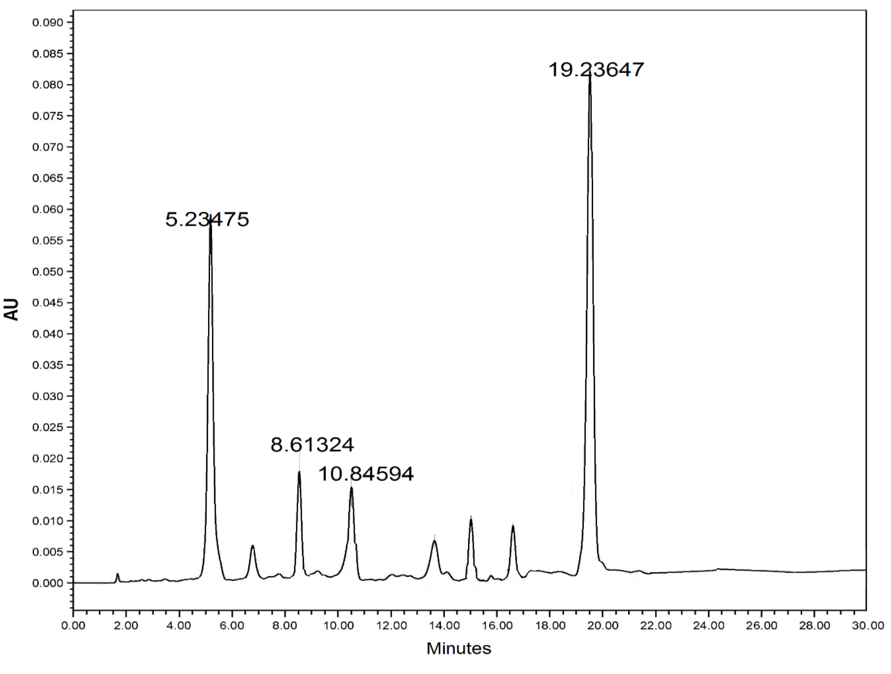 HPLC analysis of ginger extract. Representative HPLC chromatogram shows the identification and quantification of major bioactive compounds in the ginger extract.
