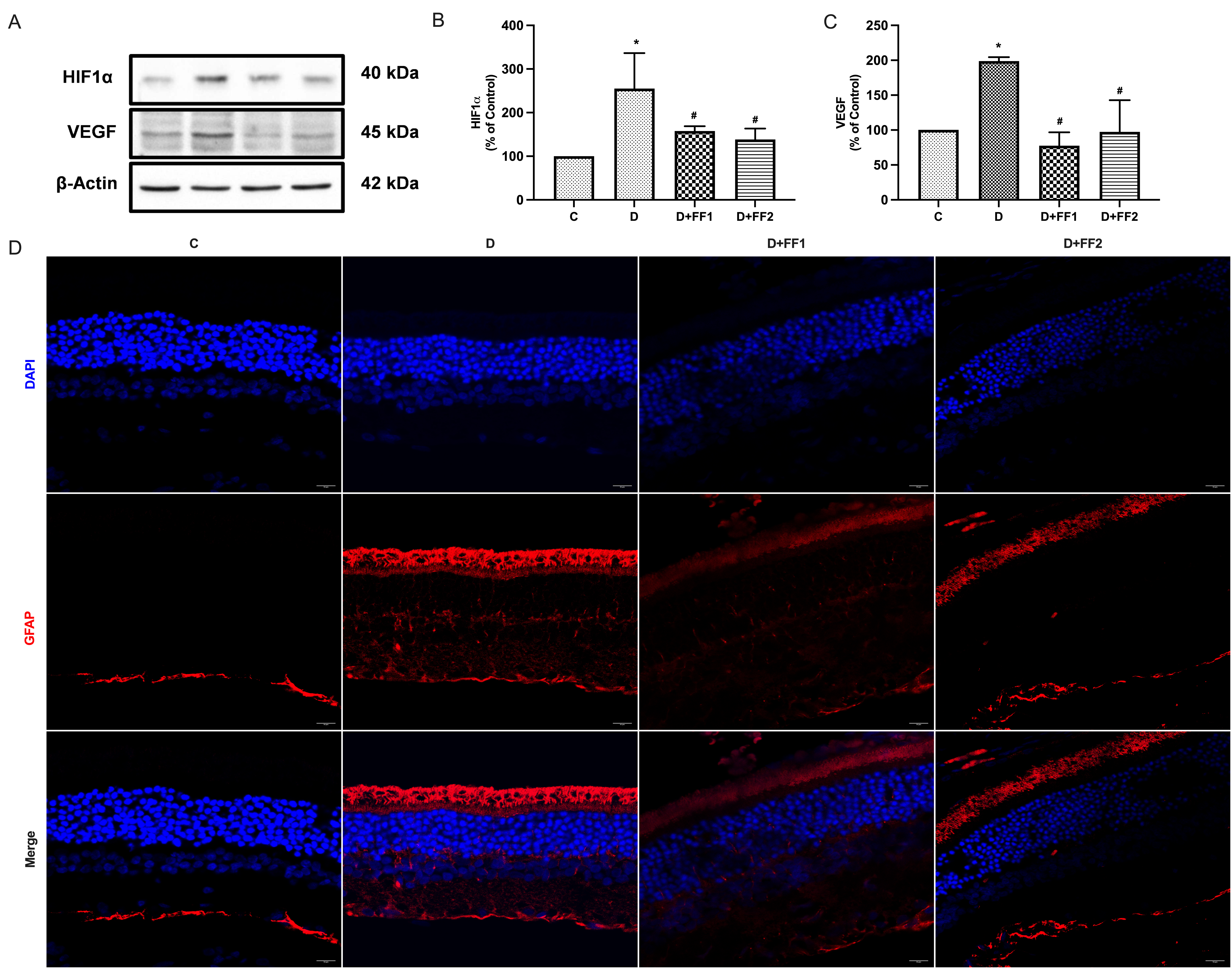 Figure 5. Functional food mix prevented retinal angiogenesis and gliosis in streptozotocin induced diabetes. A: Representative immunoblots depicting expression of HIF-1α and VEGF in rat retina. B, C: Quantitative analysis of HIF-1α and VEGF normalized with β-actin. Data represented as mean ± SD, n = 4 per group. Significant
