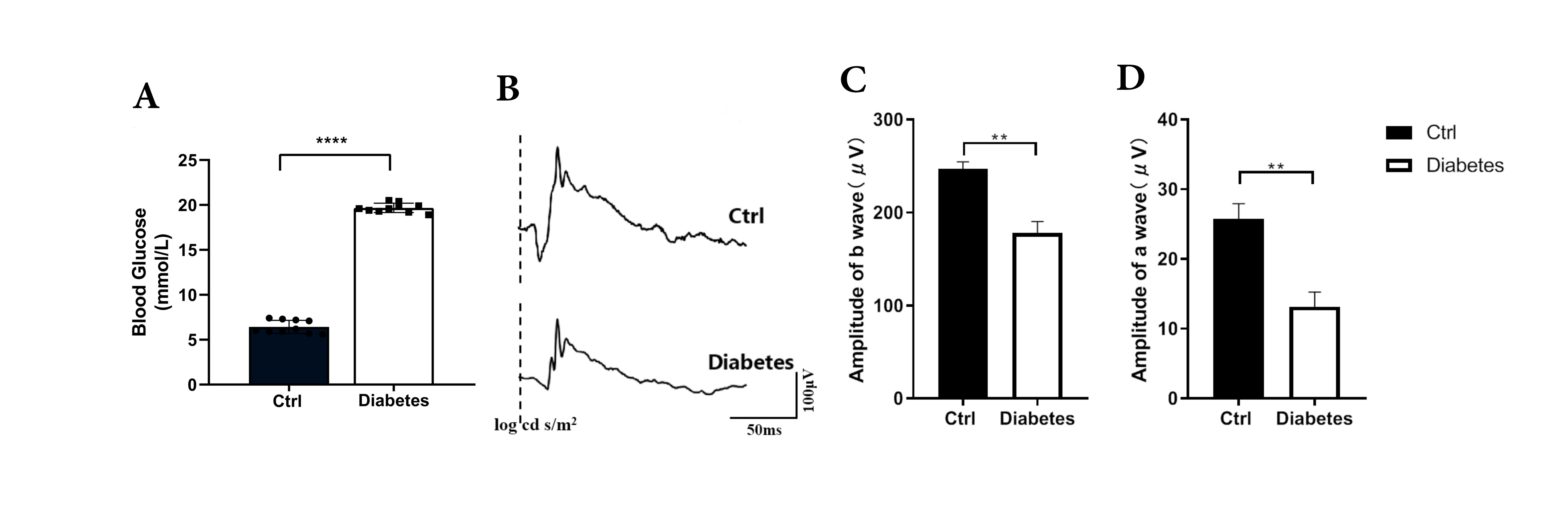 Figure 1. The diabetic mouse model shows impaired scotopic vision. A: The mice with diabetes for a month had higher random blood glucose levels than controls. n=10, ****p<0.0001. B–D: The representative electroretinographic statistical analysis in normal mice and diabetic mice shows that the amplitudes