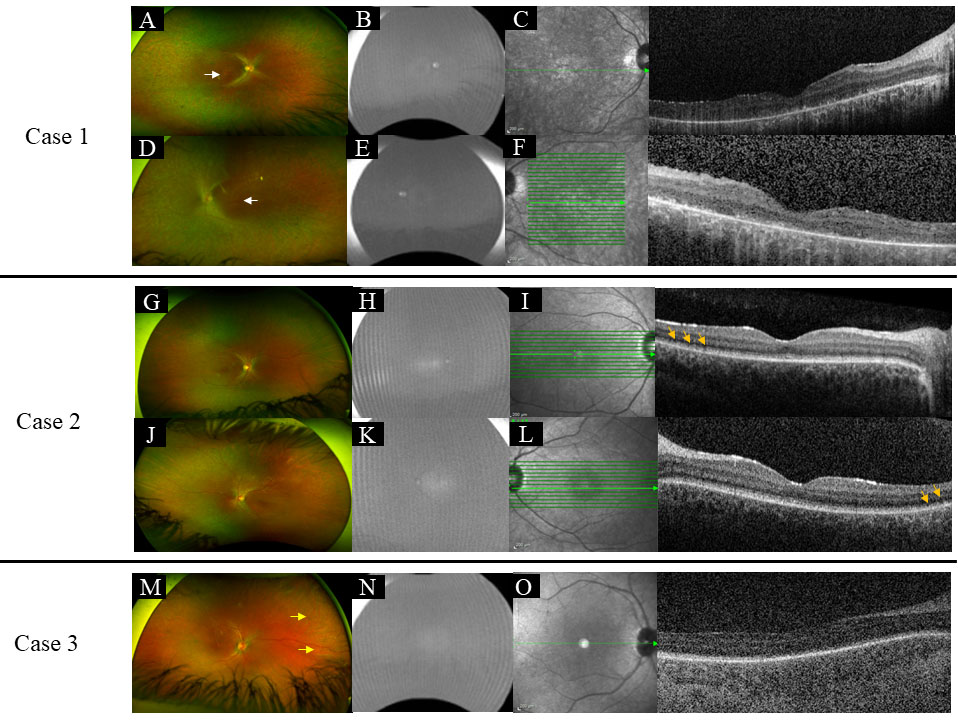 retinal changes (H and K). The OCT (I and L) shows sparse disruptions in the ellipsoidal zone and outer nuclear membrane (highlighted by the orange arrows). Case 3.