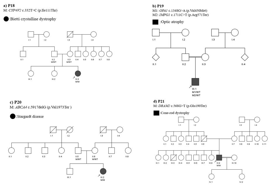 To access the data, click or select the words “Appendix 5.” Pedigrees of patients carrying potential disease-causing variants (DCVs). Panels show: (a) P18, (b) P19, (c) P20, (d) P21. DCVs detected in probands are indicated below the individual using the following notation: M/M (homozygous), M/WT (heterozygous), M (hemizygous). Genotypes of family members included in the analysis are represented similarly. In each figure, 'M' denotes the specific variant identified in the proband. The corresponding variant is detailed in the upper-left corner of the figure. A double horizontal line between individuals indicates consanguinity, whereas a line consisting of one solid and one dashed segment represents a marriage between individuals from the same village.