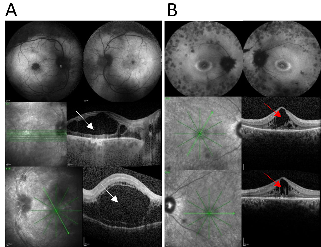 retinal degeneration characteristic of enhanced S-cone syndrome. B. P7 shows bilateral retinitis pigmentosa with widespread FAF abnormalities and cystoid macular edema on OCT (red arrows),