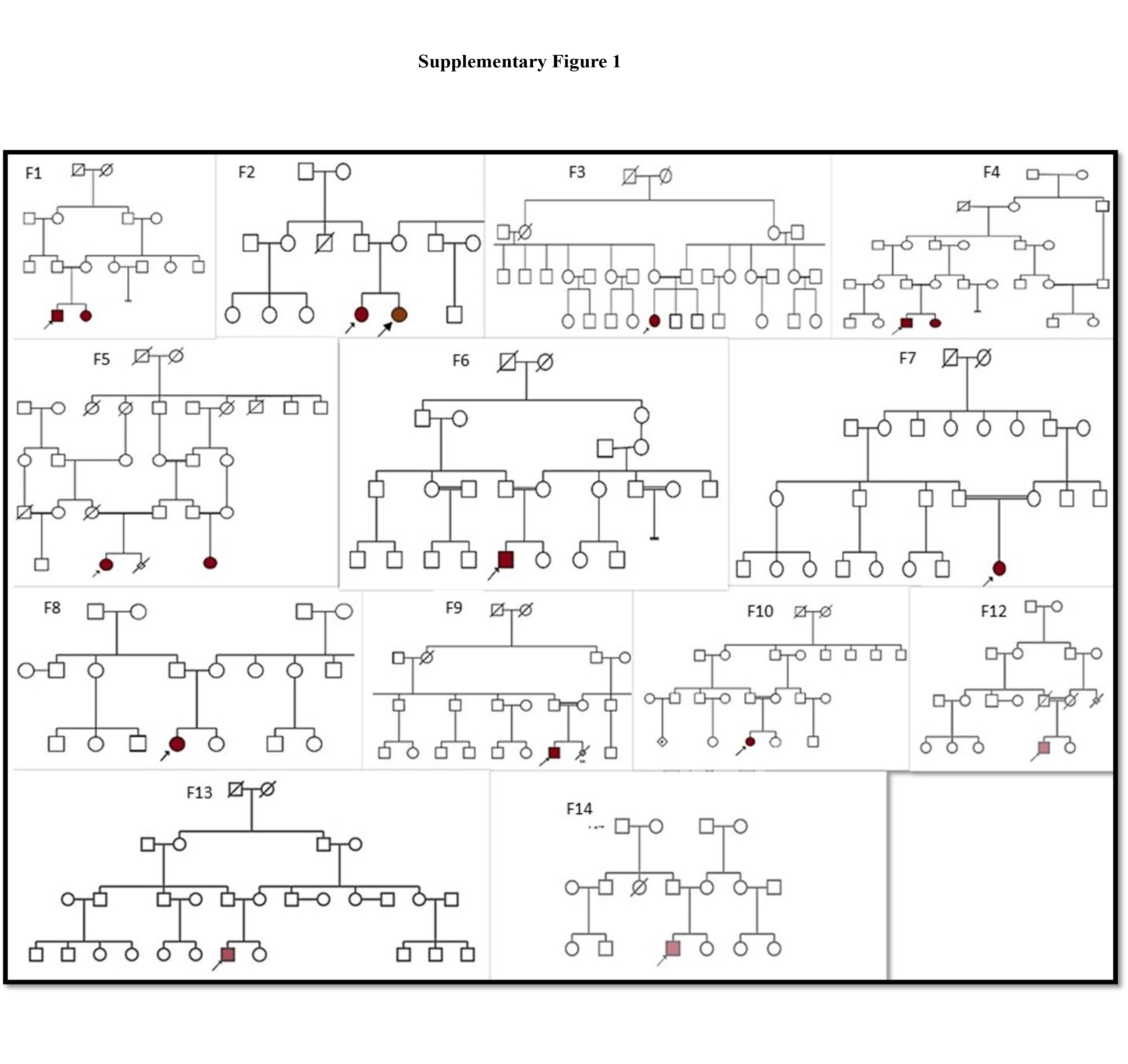 To access the data, click or select the words “Appendix 2.” Pedigree of the available families (F1-F14) of the study cohort. Proband is marked with an arrow. The affected individual is marked with filled boxes. Note 13 families had consanguinity. Family 11 (F11) pedigree was unavailable.
