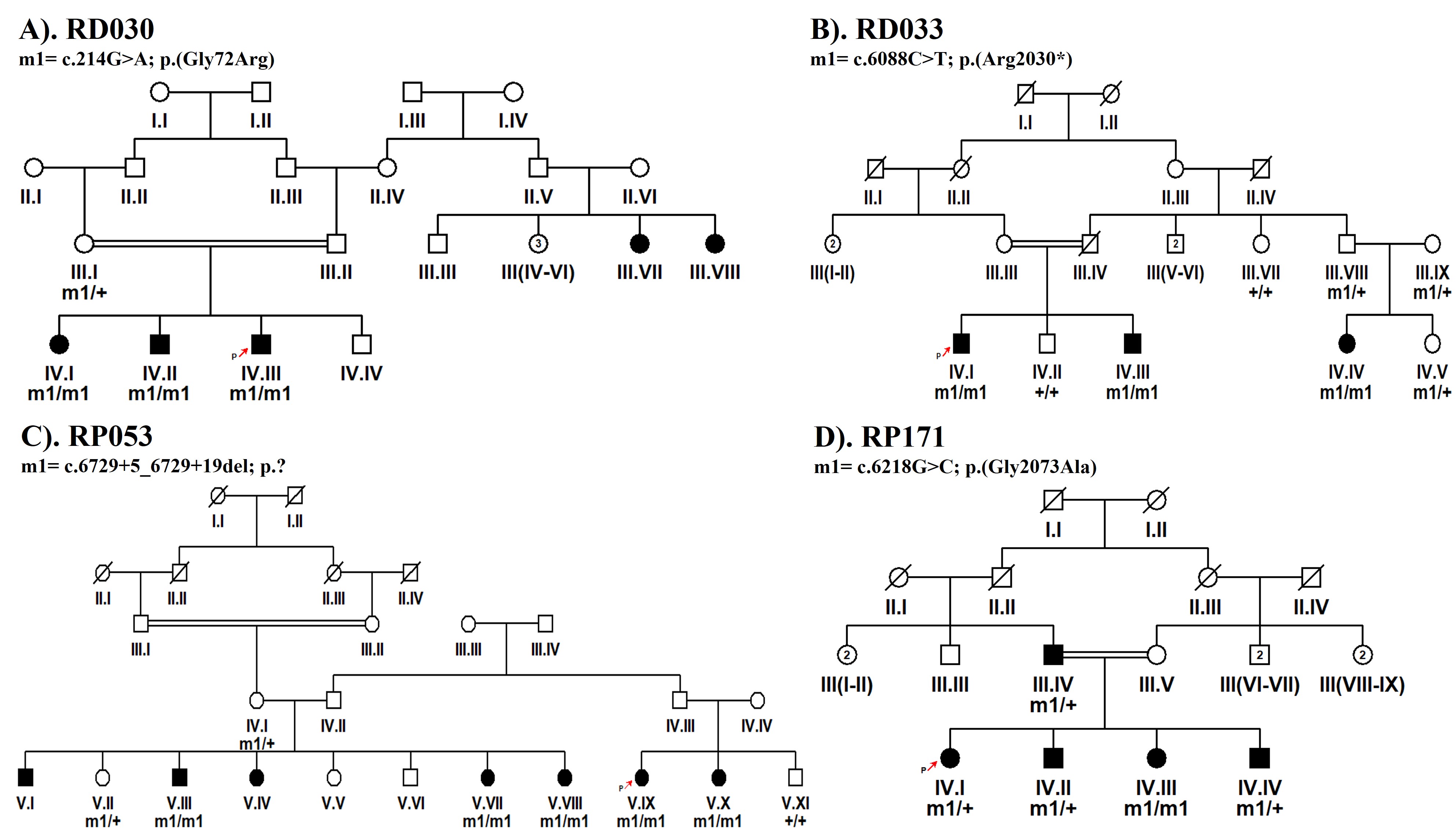 To access the data, click or select the words “Appendix 3.” Pedigrees of four inbred families RD030, RD033, RP053 and RP171 in which reported variants c.214G>A; p. (Gly72Arg), c.6088C>T; p. (Arg2030*), c.6729+5_6729+19del; p.? and c.6218G>C; p. (Gly2073Ala) respectively in ABCA4 were identified respectively. Empty squares and circles show the unaffected males and females, respectively. The filled shapes show the affected individuals. The symbol labeled with a red arrow in each pedigree highlights the proband. Consanguineous unions are indicated by double lines.