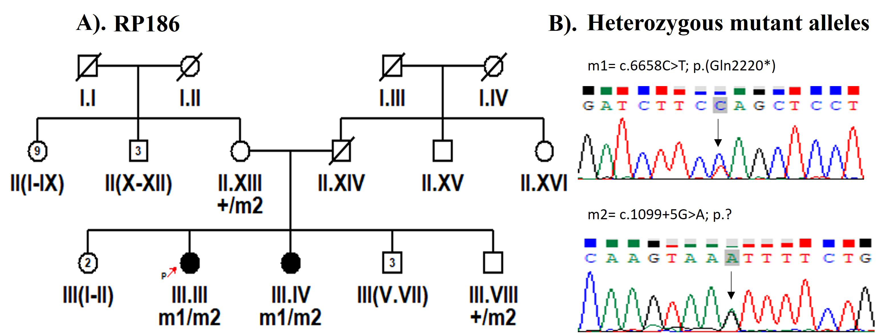 Figure 1. Pedigree of family RP186. A. Pedigree of family RP186 shows the segregation of the two heterozygous ABCA4 single nucleotide substitutions, c.6658C>T causing p.(Gln2220*) and a novel splice site change c.1099+5G>A in a compound