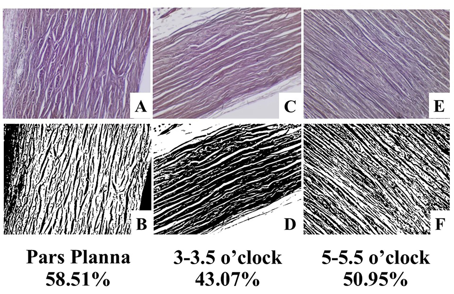Figure 6, shows the lowest density at 3:00–3:30. Original magnification is x200. A and B demonstrate the pars plana with 58.51%.,