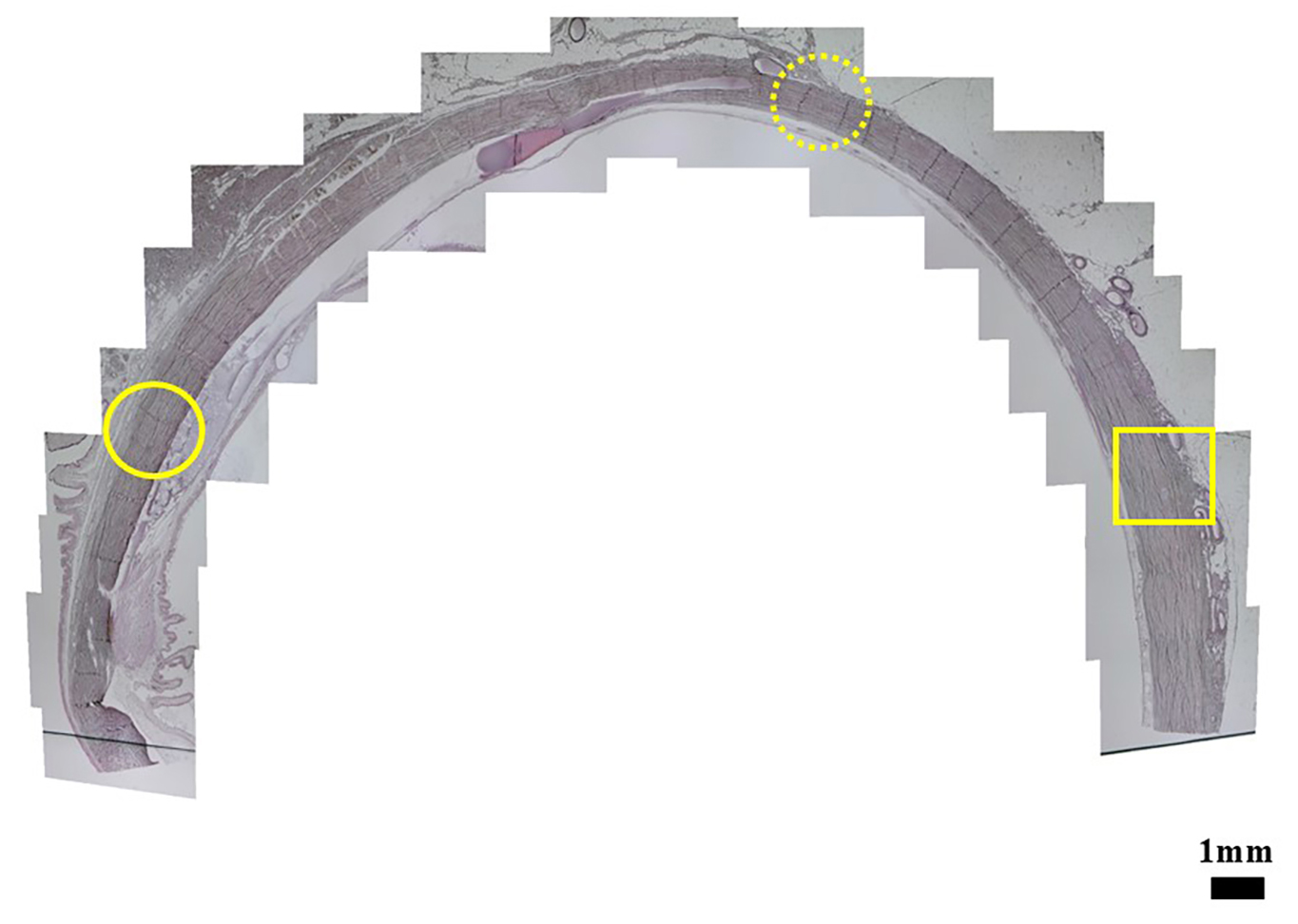 Overview of the sclera from a 79-year-old male. Scale bar means 1 mm. Circle indicates parts plana; dotted line, 3:00–3:30 region and square, 5:00–5:30 region.