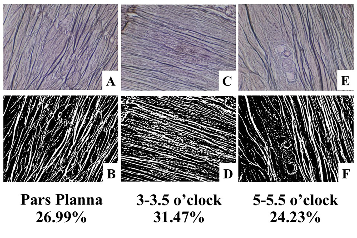 Figure 8, shows the highest density at 3:00–3:30. Original magnification is x200. A and B demonstrate the pars plana with 26.99%.,