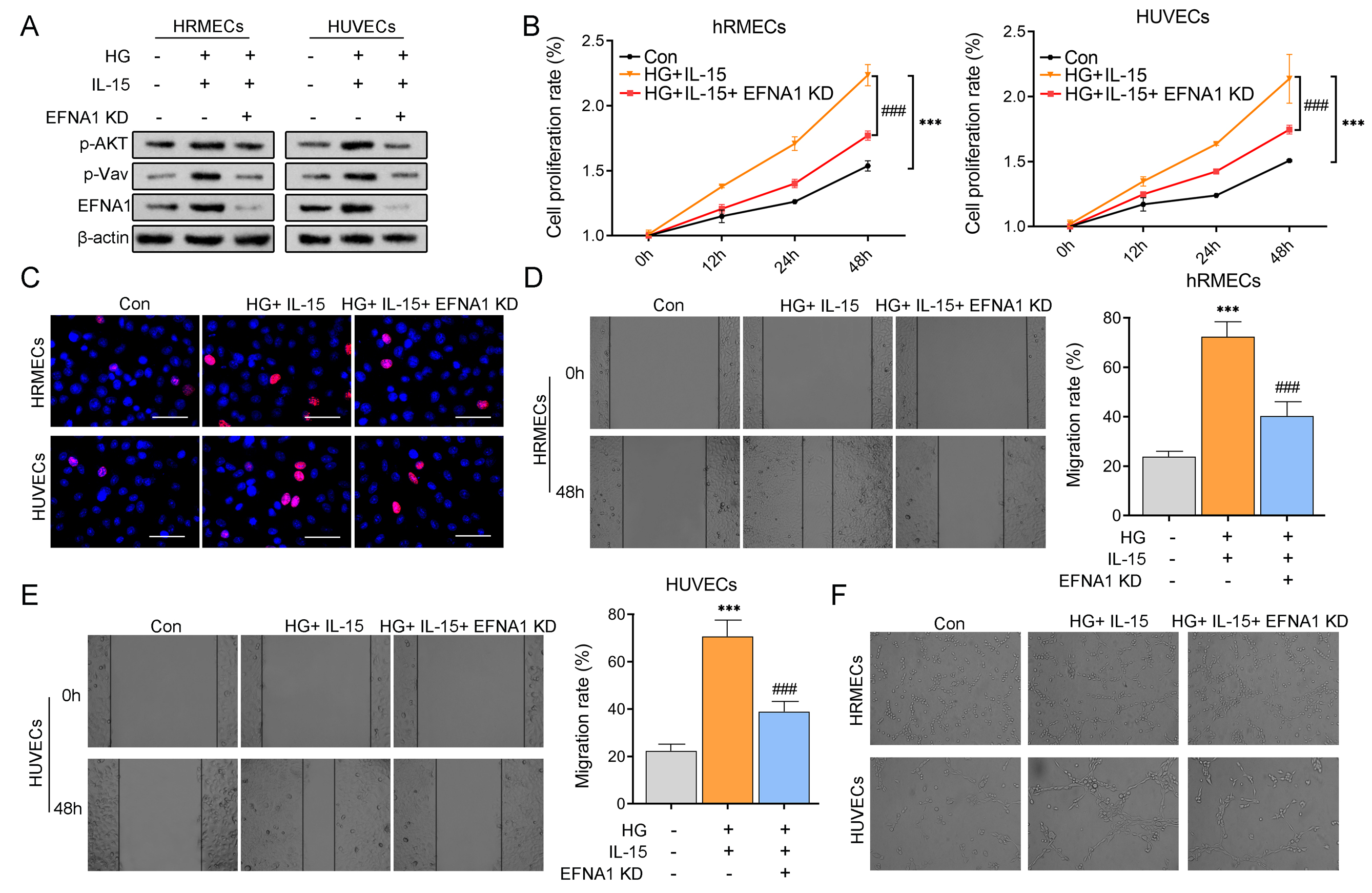 to detect the protein expression levels of p-AKT, p-Vav, and EFNA1. B. CCK8 was used to detect the cell proliferation rate of vascular endothelial cells cultured for 0, 12, 24, and 48 h. C. EdU staining was used to assess cell proliferation ability. D,E. The cell wound-healing assay was used to detect cell migration ability. F. The angiogenesis assay was used to detect tubule formation ability. *p < 0.05,**p < 0.01,***p < 0.001 versus Con. #p < 0.05, ##p < 0.01, ###p < 0.001 versus HG+IL-15. n = 3. Statistical significance was determined by using one-way analysis of variance for more than