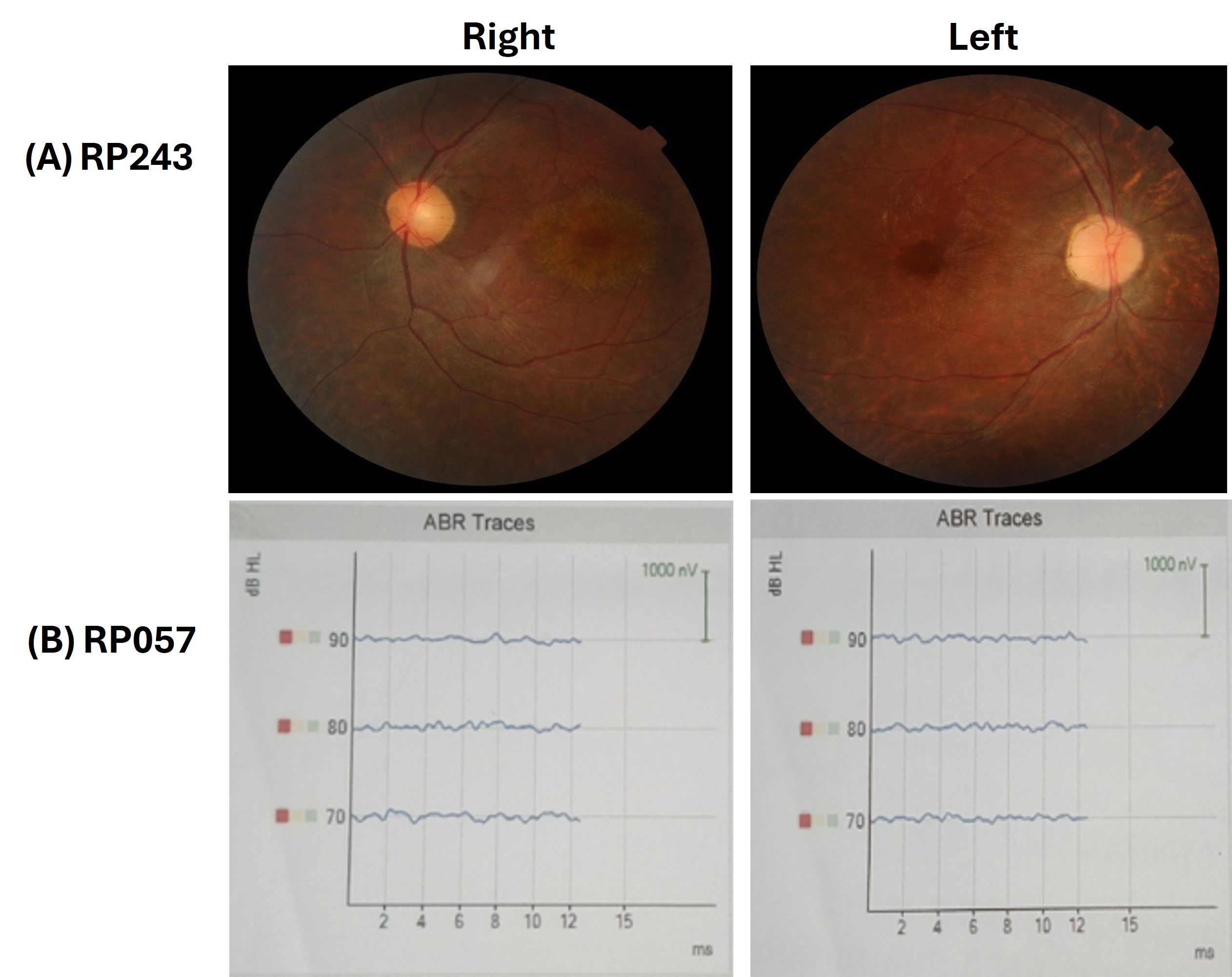To access the data, click or select the words “Appendix 2.” (A) Fundus photographs of right and left eye of an affected individual (IV. IX) of RP243 showing pale optic disc, bony spicules and thin blood vessels characteristic of RP phenotype and (B) ABR testing results of right and left ear of an affected individual (IV. II) of RP057. The x-axis depicts hearing level in dB (decibels).