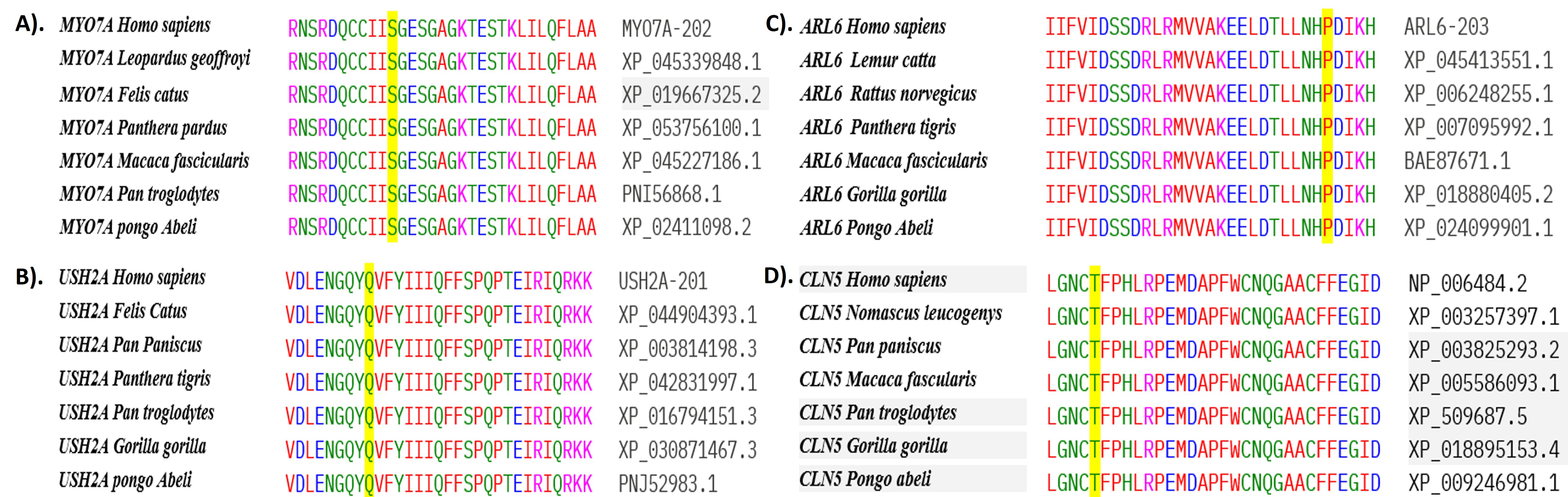 substitutions (highlighted red) were identified in this study. A: Conservation of serine at position 157 in the MYO7A protein. B: Conservation of glutamine at position 381 in the USH2A protein. C: Conservation of proline at position 116 in the ARL6 protein. D: Conservation of threonine at position 194 in the CLN5 protein.