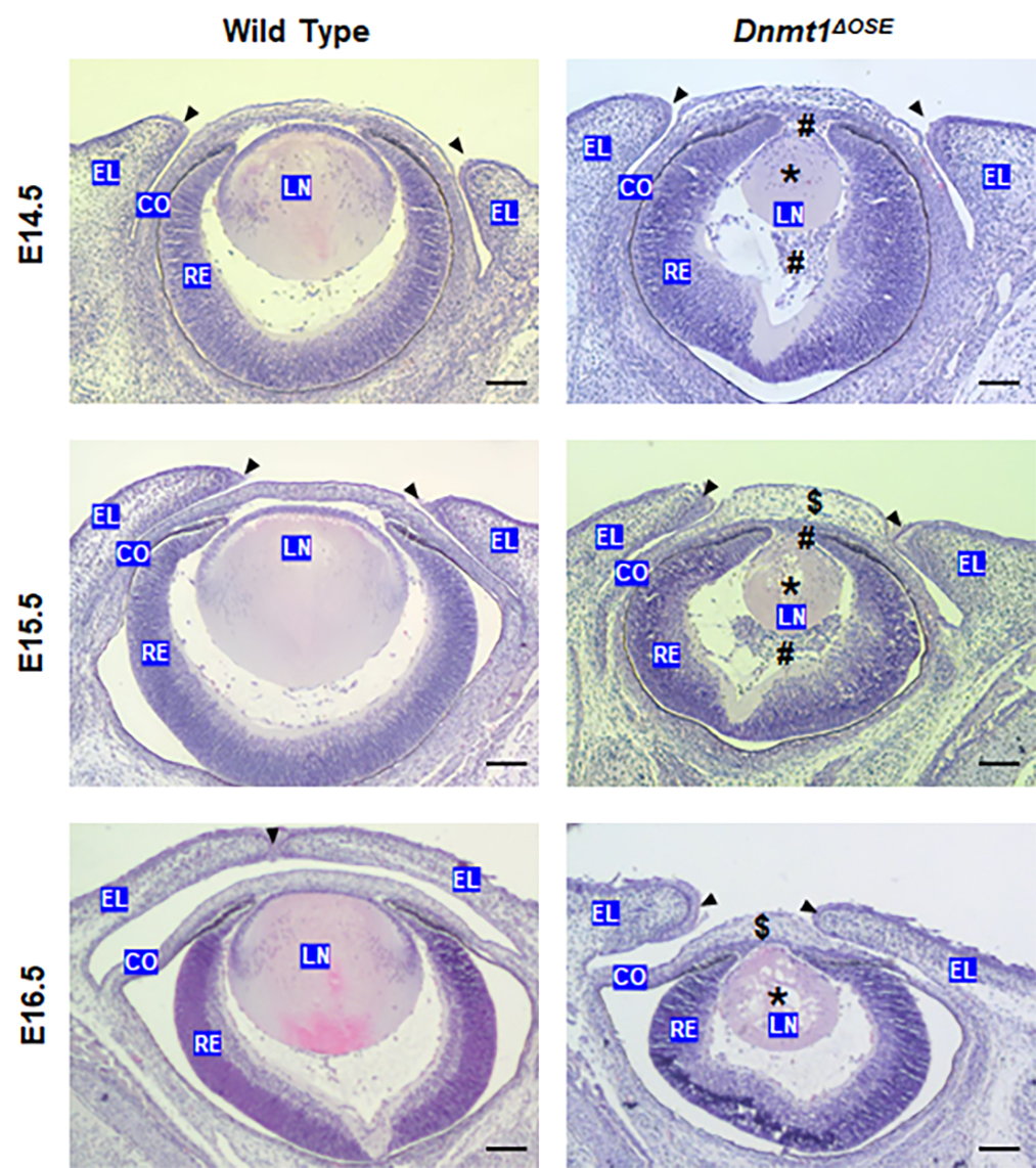the degenerative lens in the Dnmt1ΔOSE eyes. EL, eyelid; CO, cornea; RE, retina; LN, lens. Images are representative of at least three mice/genotypes. Scale bars: