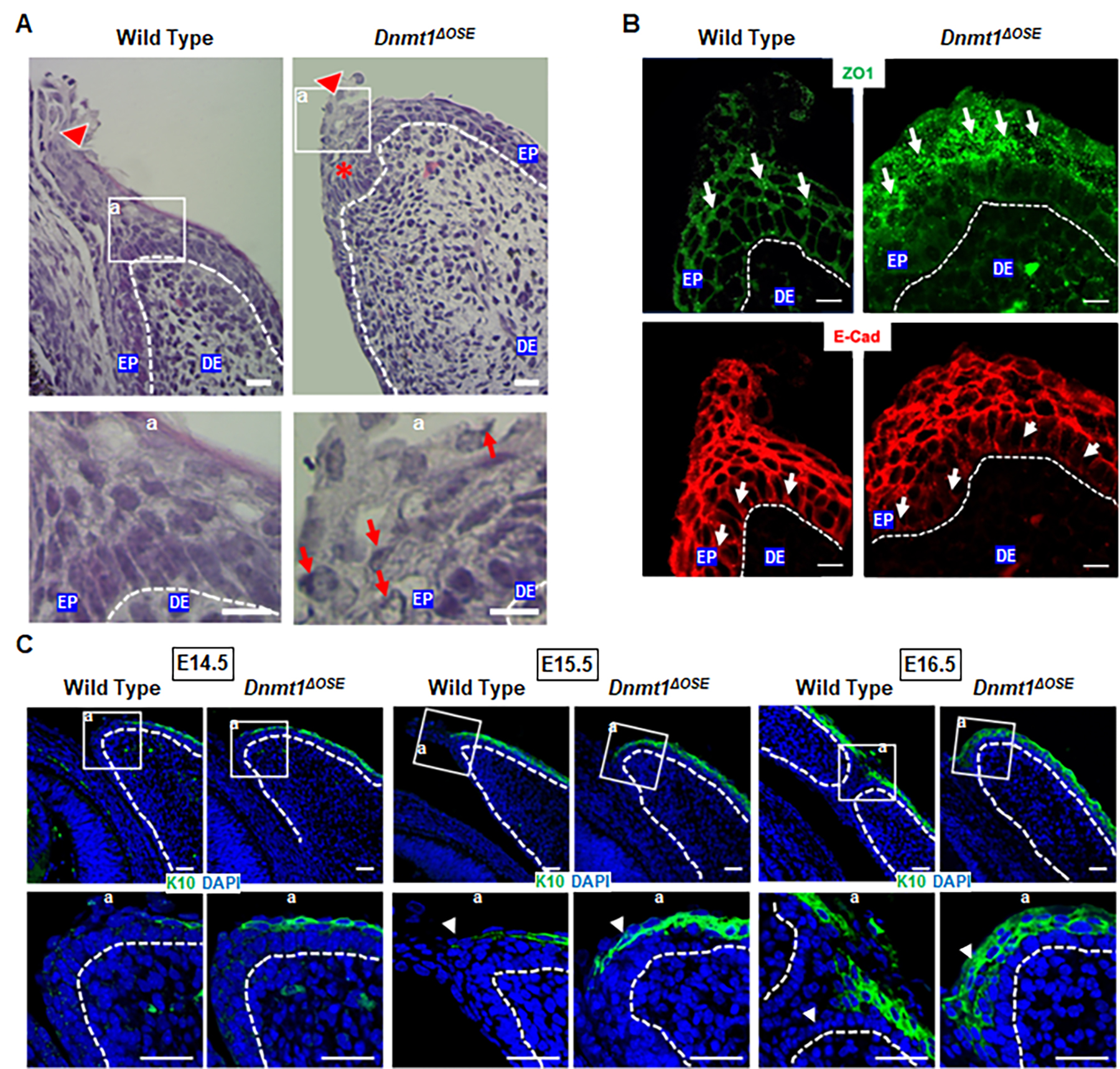 in the Dnmt1ΔOSE eyelids. C: Wild-type and Dnmt1ΔOSE embryonic eyelids at embryonic days indicated were subjected to immunostaining with anti-K10 for epithelial terminal differentiation.