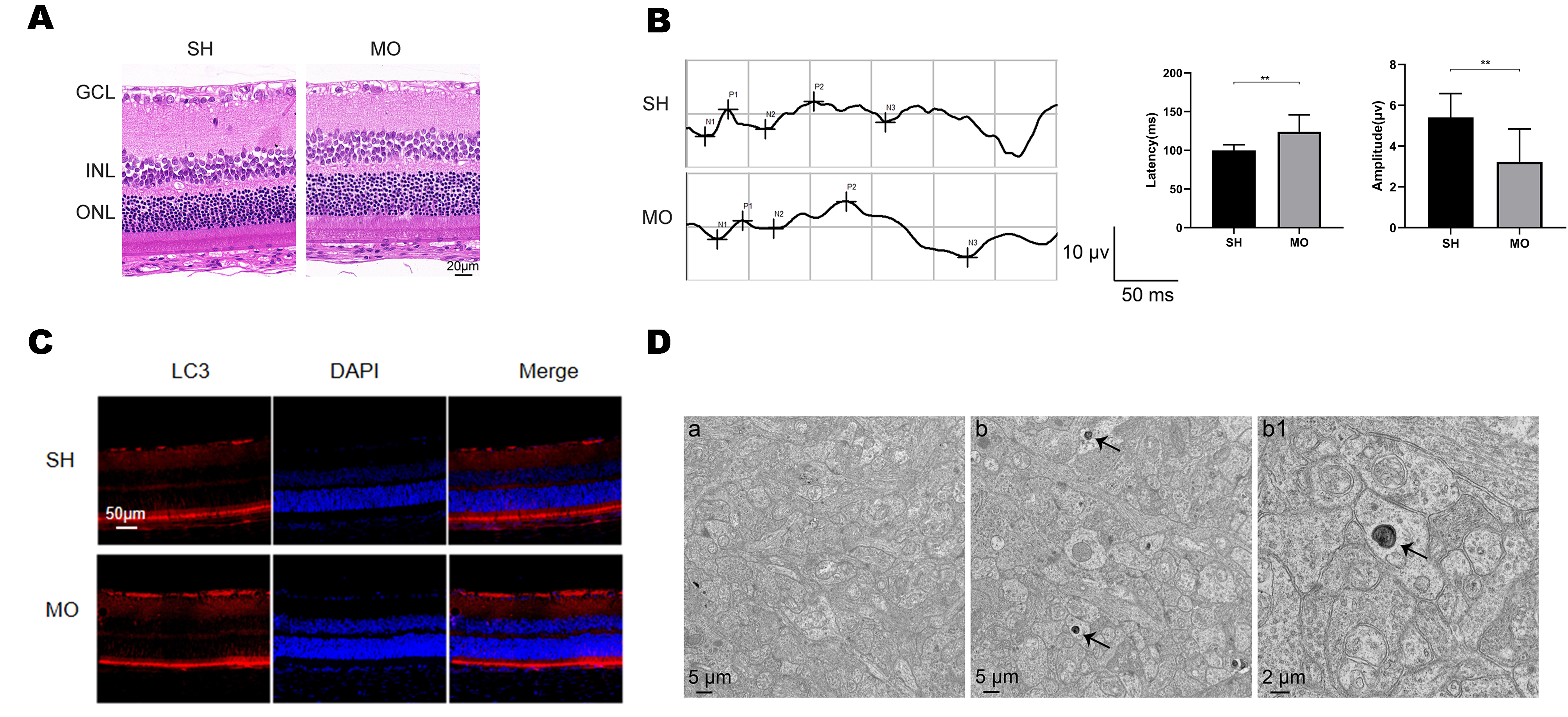 group. GCL, ganglion cell layer; INL, inner nuclear layer; ONL, outer nuclear layer. B: The changes in F-VEP in the SH and MO groups (n = 9). Mean ± standard deviation; **p < 0.01. C: Immunofluorescence staining was used to assess LC3 protein in the retinal tissues of the SH and MO groups. D: The retinal tissue of rats was observed under a transmission electron microscope. a, Normal retinal ultrastructure; b, retinal