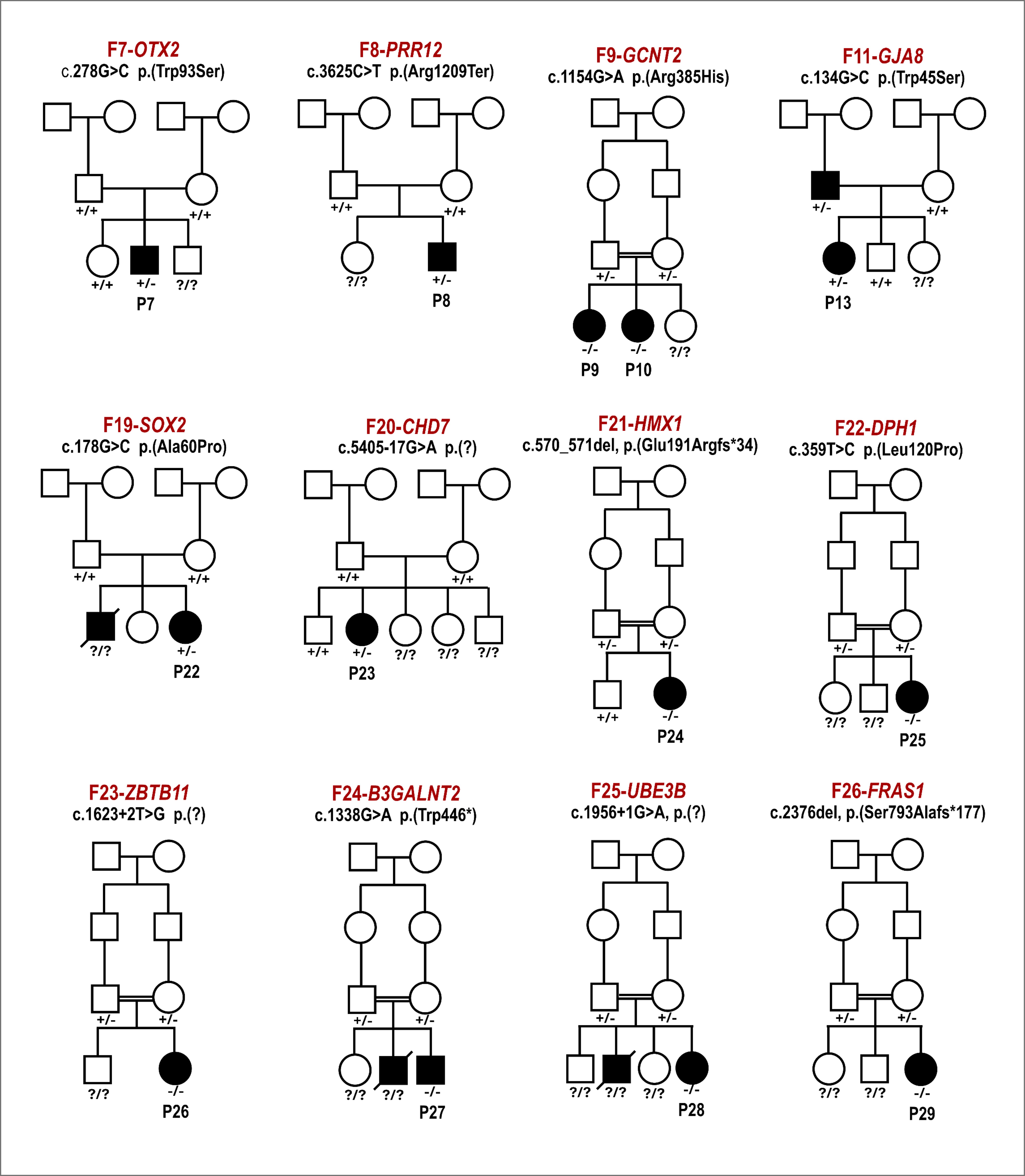 Figure 2. Pedigree figures of twelve families showing allele segregation. The squares and the circles represent males and females, respectively.