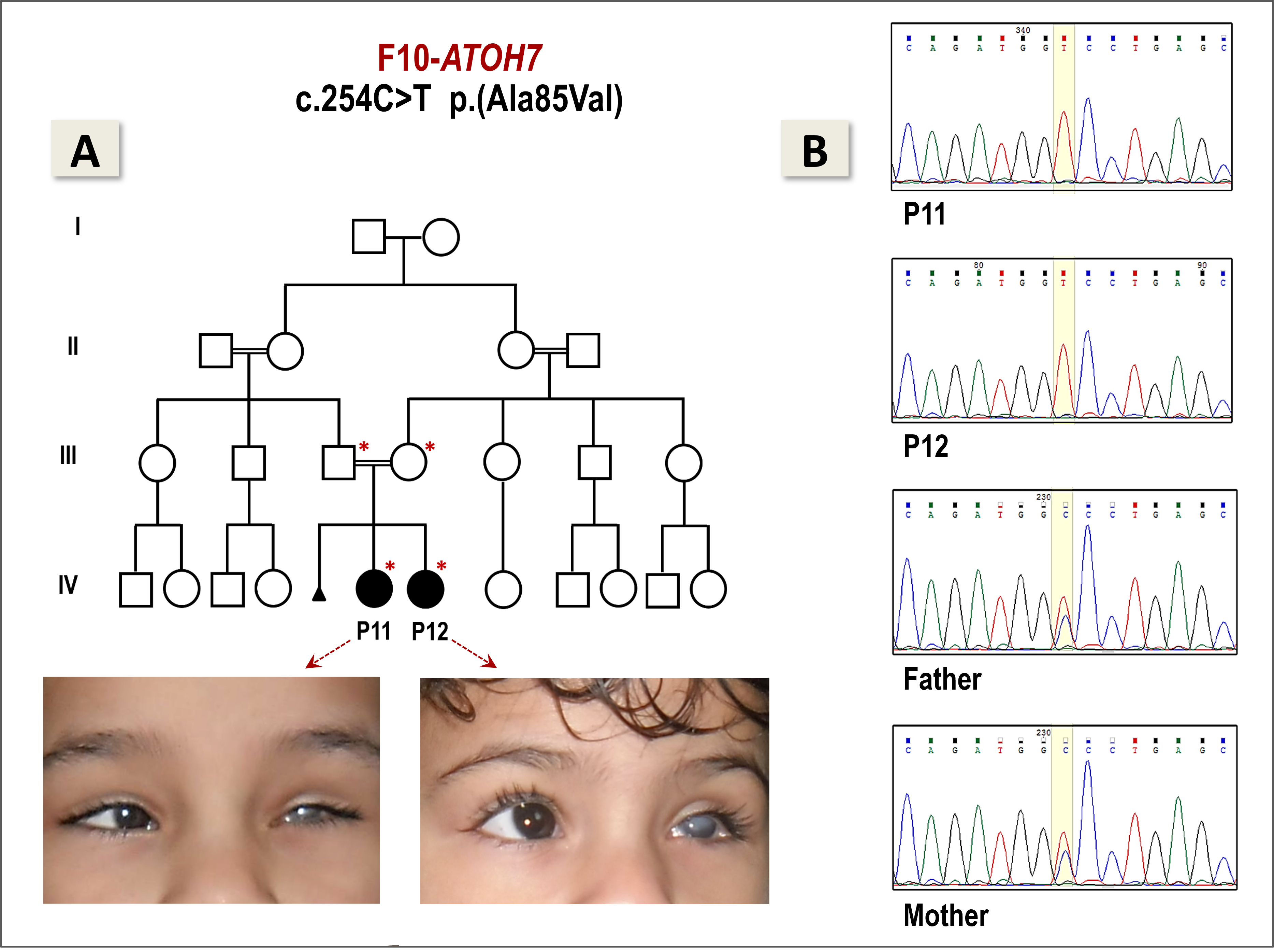 Figure 3. Identification of a novel homozygous likely pathogenic variant in ATOH7 (c.254C>T). A: The family pedigree demonstrating two similarly affected sisters (F10/P11&12) born to consanguineous healthy parents. Below