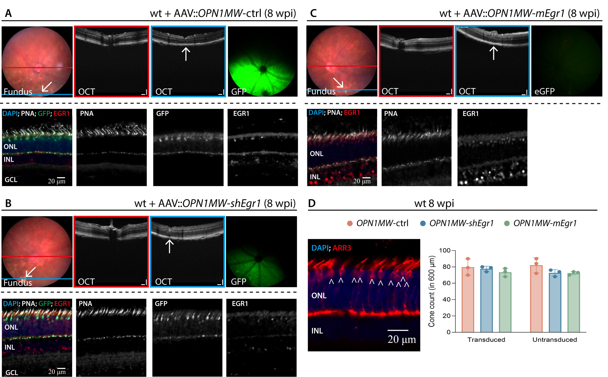 across the injection site. Immunofluorescence panels show the transduction pattern of the virus (GFP, except AAV::OPN1MW-mEgr1) as well as EGR1 and PNA-positive cells as grayscale images and the colored merge. Scale bars: 20 μm. D) Left panel: example image of a cone arrestin (ARR3) staining in wt mice. Right panel: bar graph reporting the number of