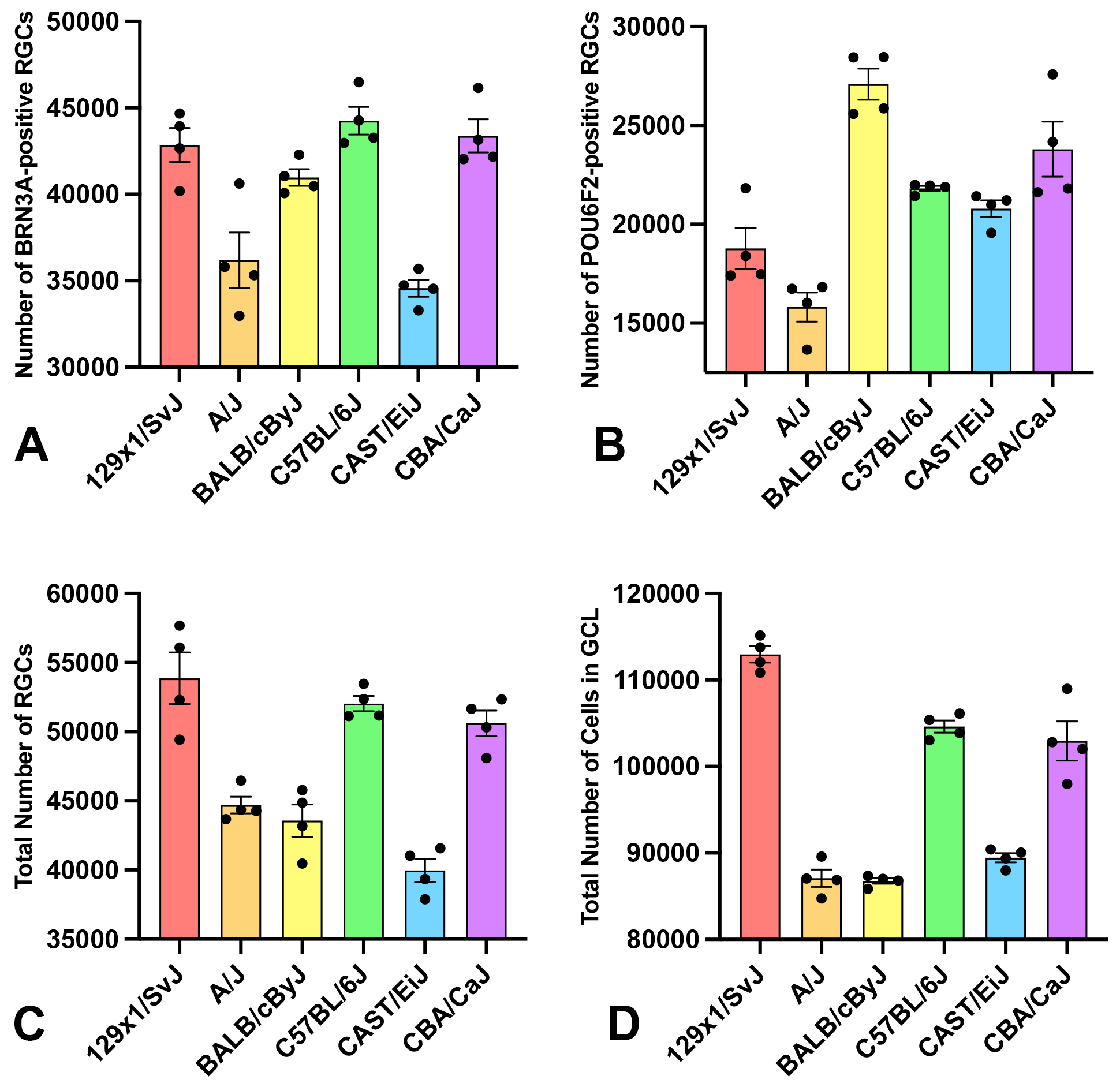 Figure 3. The number of RGC in six different inbred strains (129×1/SvJ, A/J, BALB/cByJ, C57BL/6J, CBA/CaJ, and CAST/EiJ) of mice is
