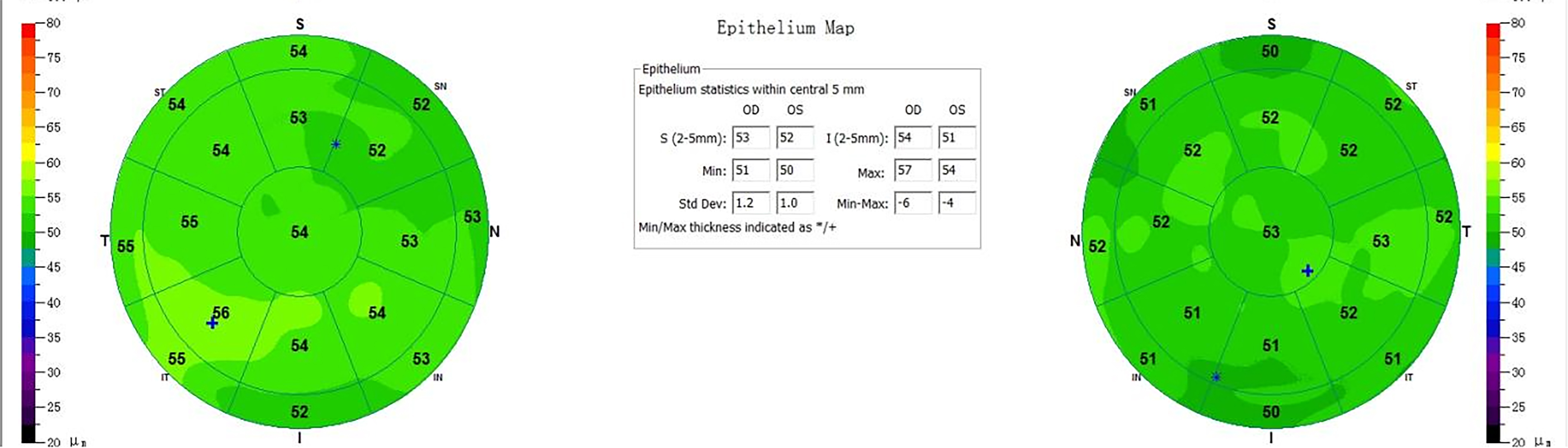Results and parameter values of RTVue XR OCT measurement of corneal epithelium in the 0- to 6-mm area.
