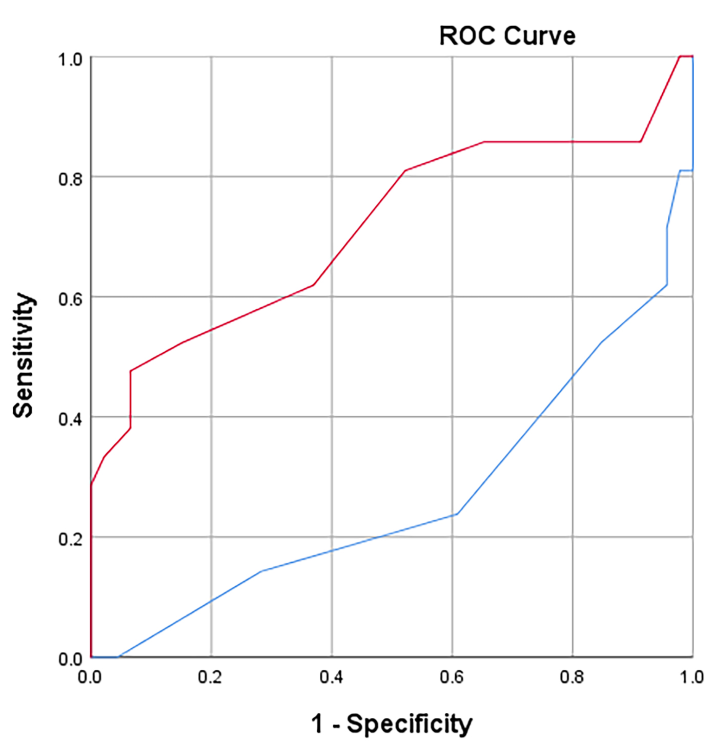 Distinguishing Min-Max and SD between the preclinical keratoconus group and the normal control group. Dev value corresponds to the ROC curve. Curve colors: Min-Max: red; SD: blue.