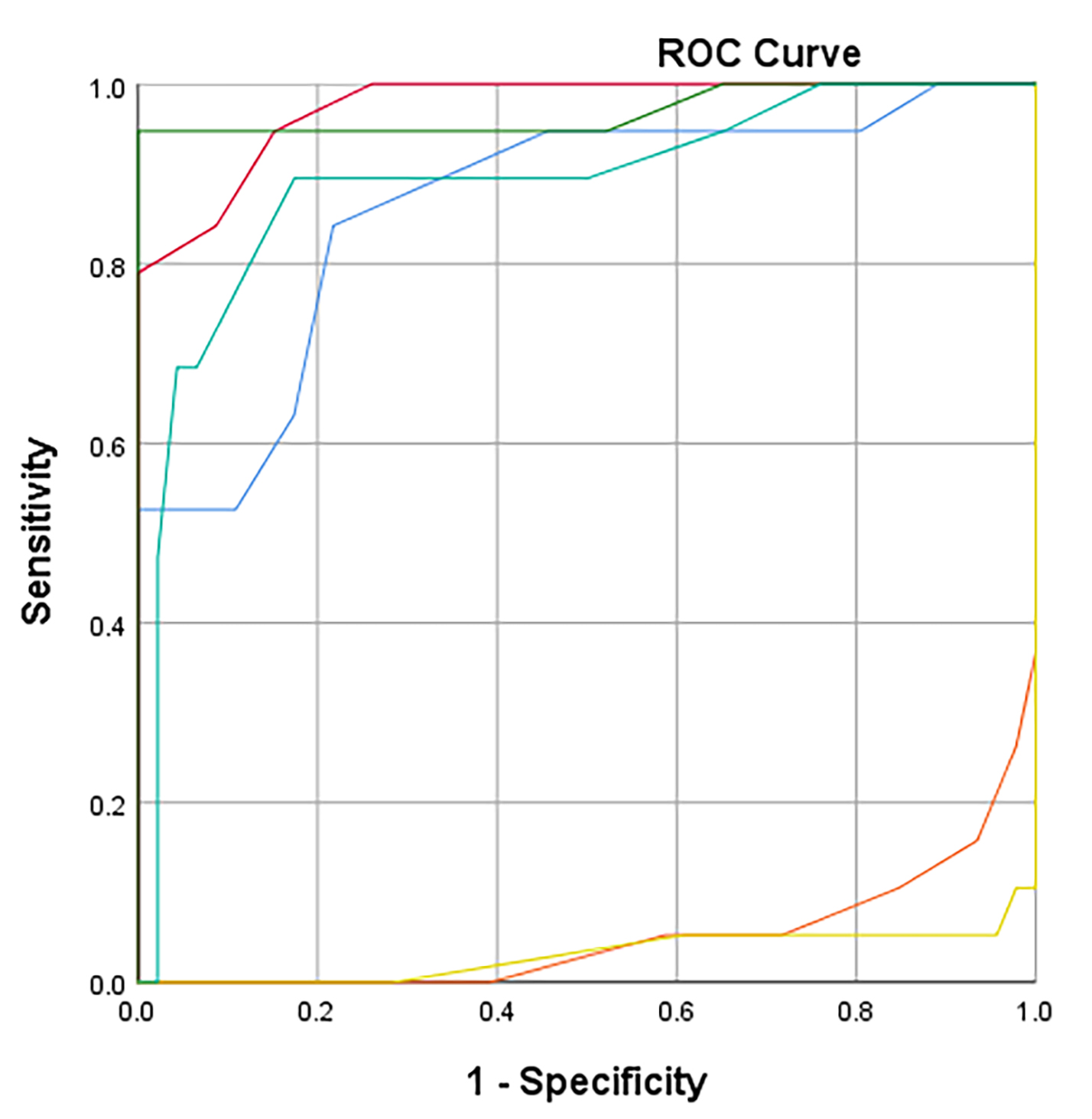 Figure 3. ROC curves corresponding to S-I, SN-IT, Min, Max, Min-Max, and SD values for distinguishing mild keratoconus in the clinical