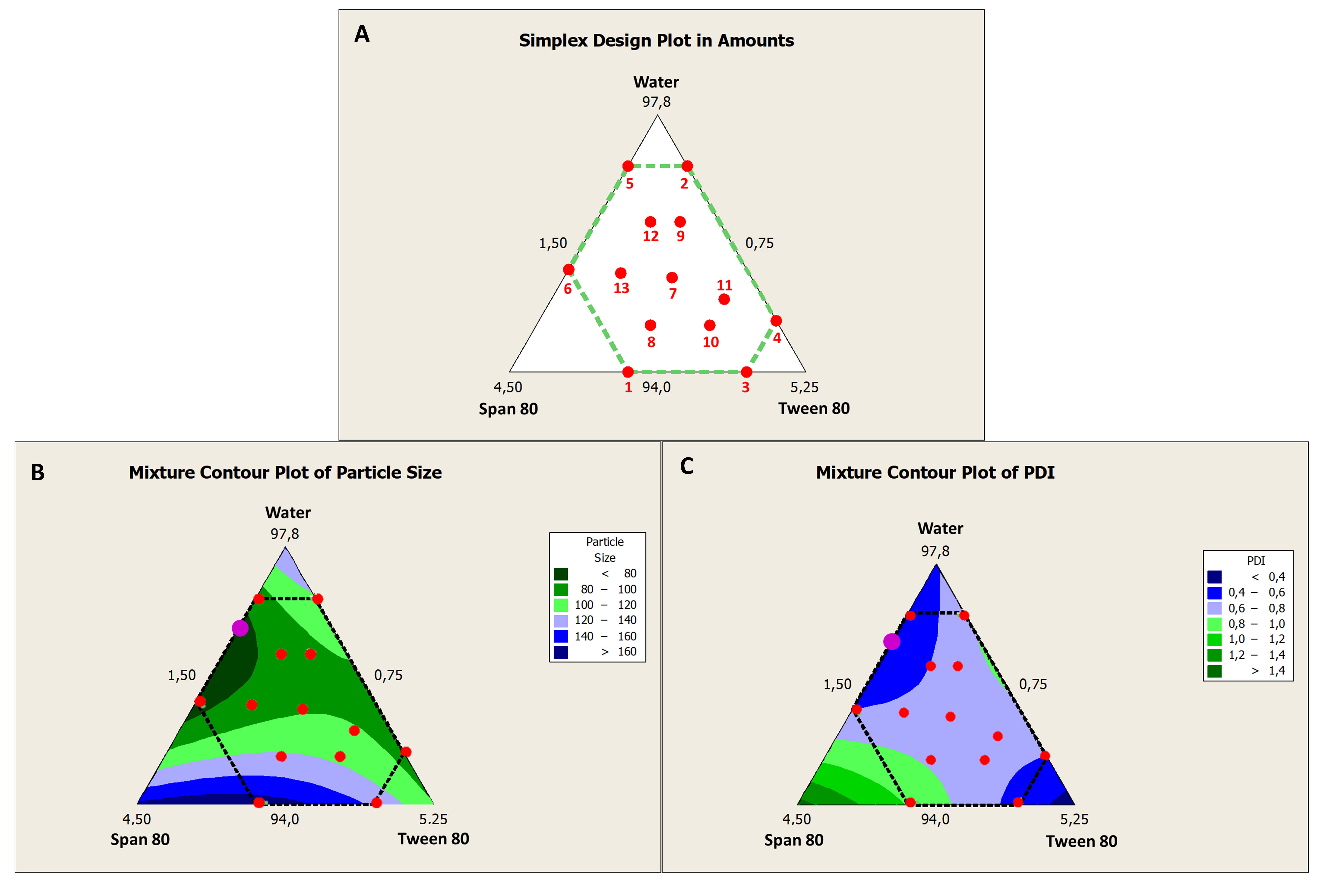 Representation of formulation numbers on the contour plots (A), particle size results on contour plot (B) and PDI results on contour plot (C).