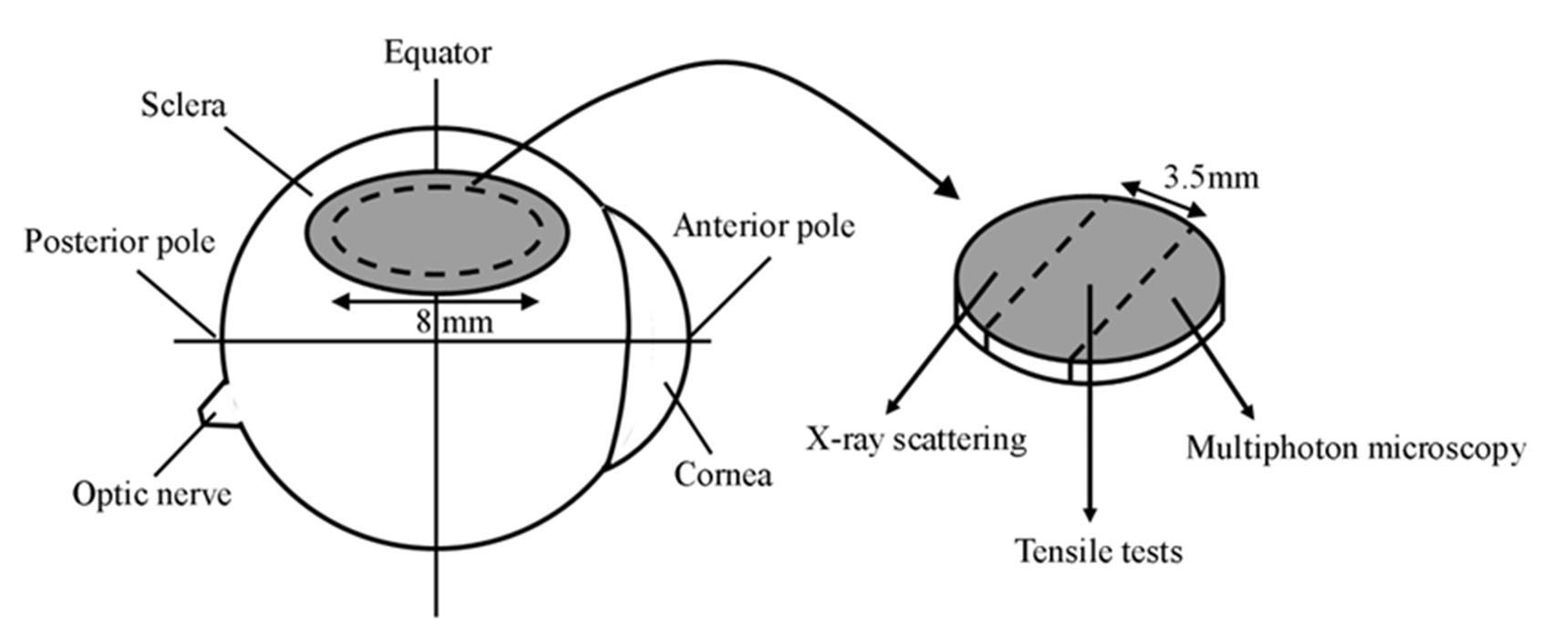 Location of WST11/NIR treatment area (shaded region) on the rabbit eye and the use of dissected scleral specimens. Broken lines denote dissection cuts.