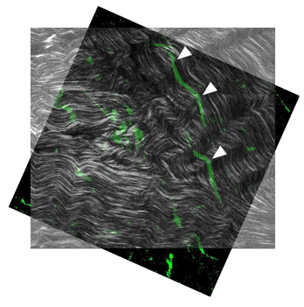 at a depth of 50 μm. Arrowheads: similar crimped morphology between the treatment-induced wavy structures in TPF and the collagen