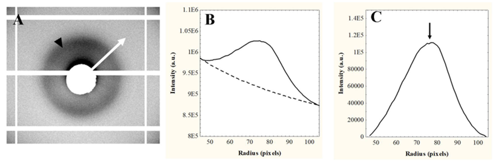 integrated, and the radial profile is extracted along the direction of the white arrow. B: A power-law background function (broken line) of the form I = aRb, where a and b are constants, is fitted to the extracted intensity data (solid line). C: Background removal allows the pixel position of the IMS peak (arrow) to be measured.