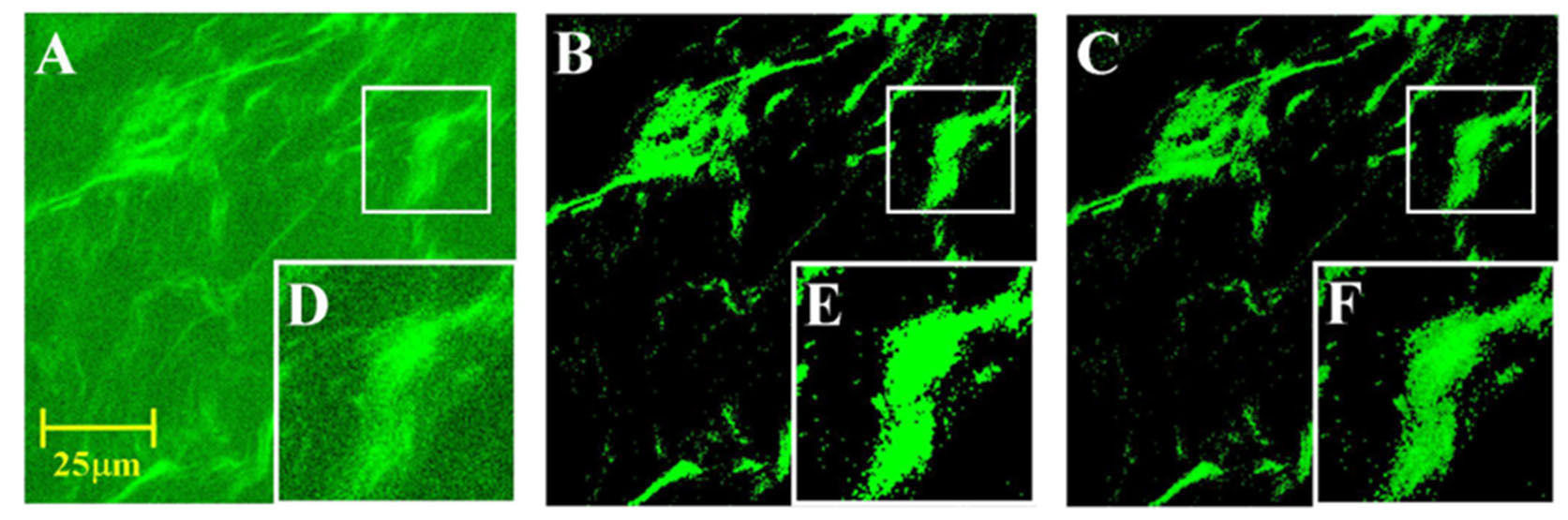 Figure 3. Two-photon fluorescence (TPF) image processing. A: Raw TPF image. B: Binary mask of noise-filtered and thresholded pixels to isolate TPF-emitting structures. C: Mask from (B) is applied to raw image in (A) to produce the final segmented image for numerical analysis. D–F: Region of interest bounded by white squares is shown at 4× magnification.