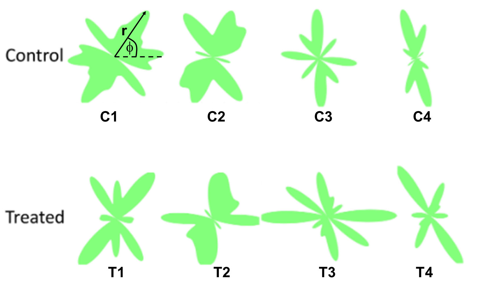 Figure 7. X-ray scattering results. Polar vector plots of scleral collagen orientation distribution for four control/treatment sample