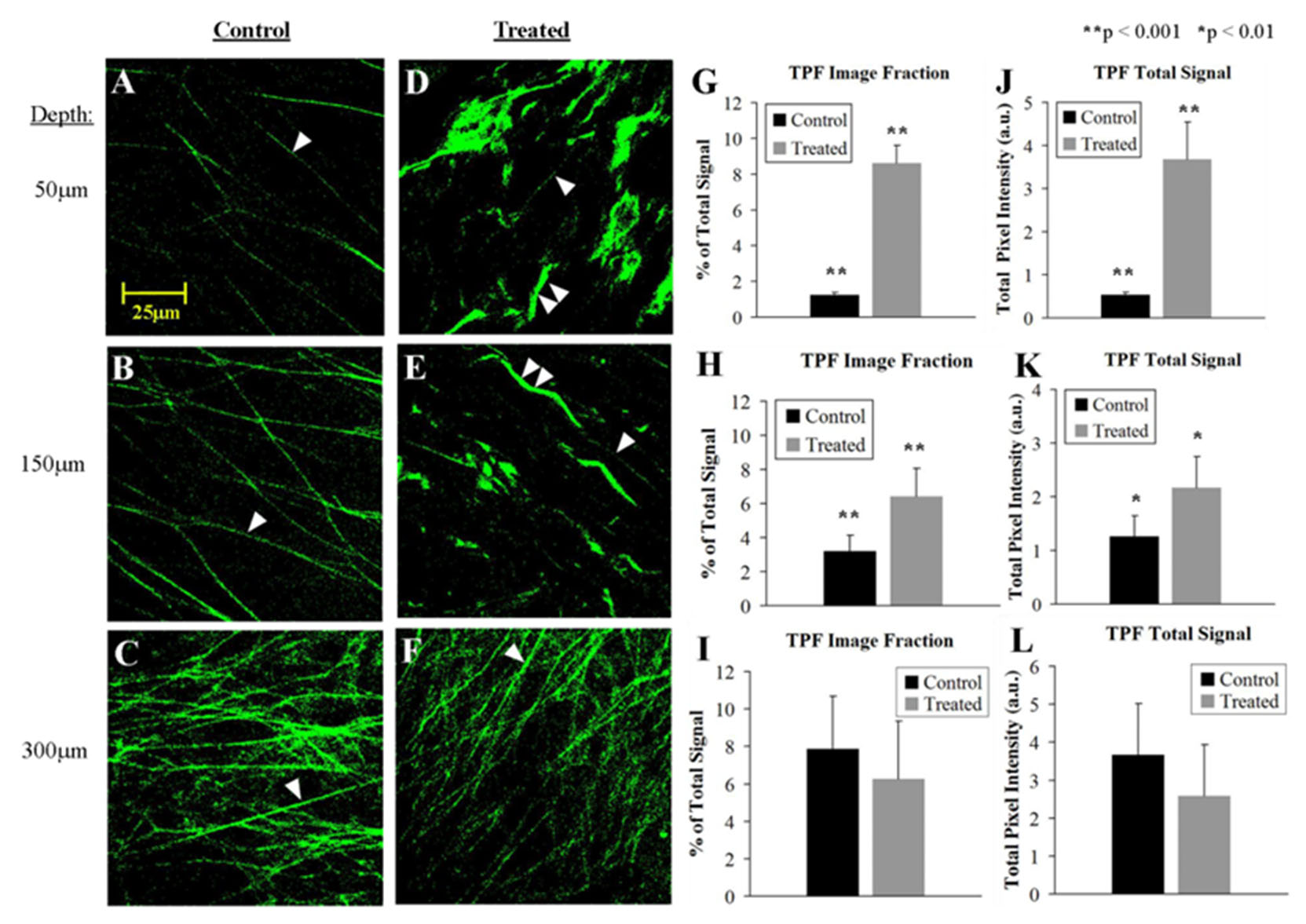 in the deep stroma. J–L: A corresponding trend is also observed for total (summed) segmented TPF signal. Error bars denote standard deviation.