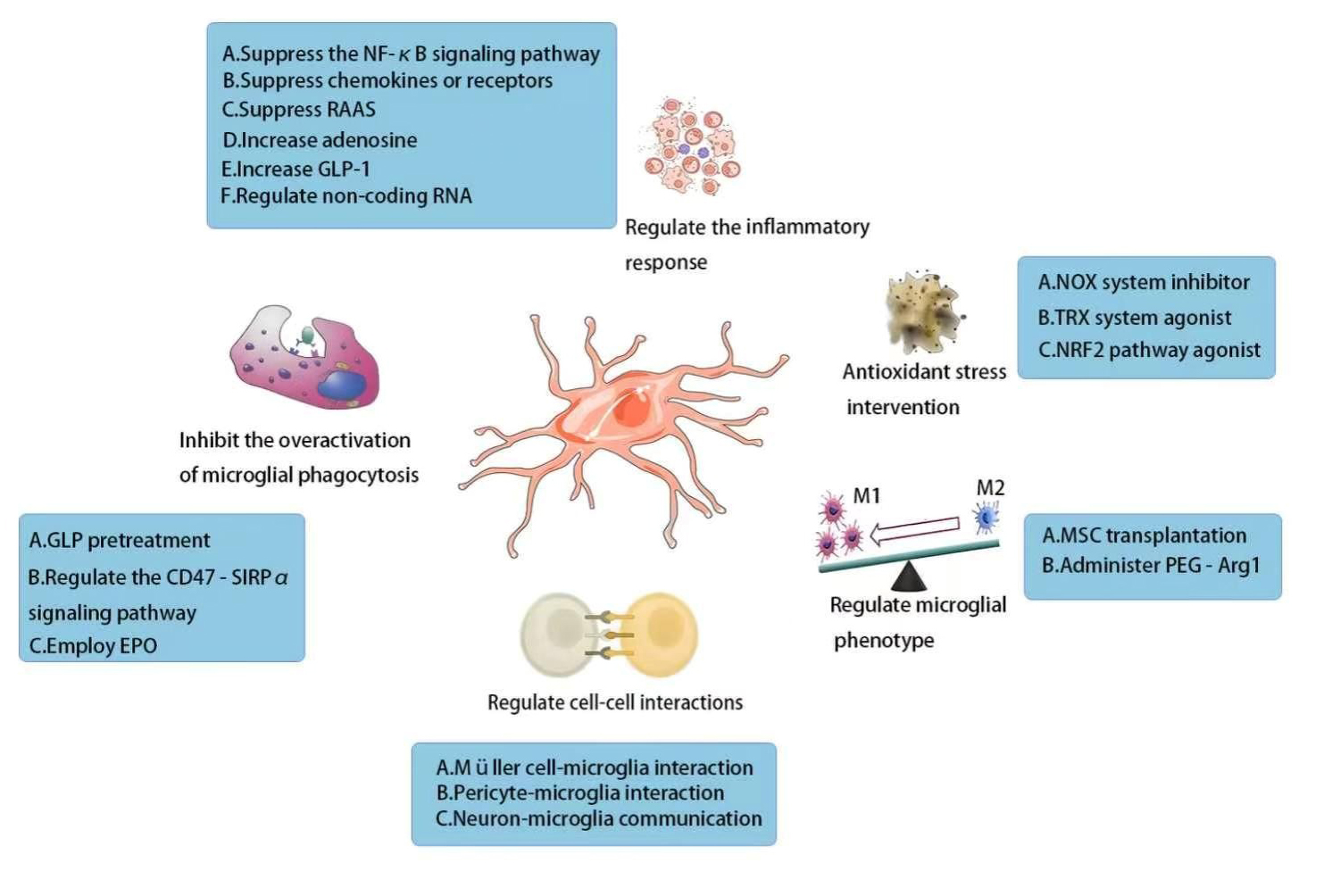 Five therapeutic strategies for microglia and the related research progress of each strategy.